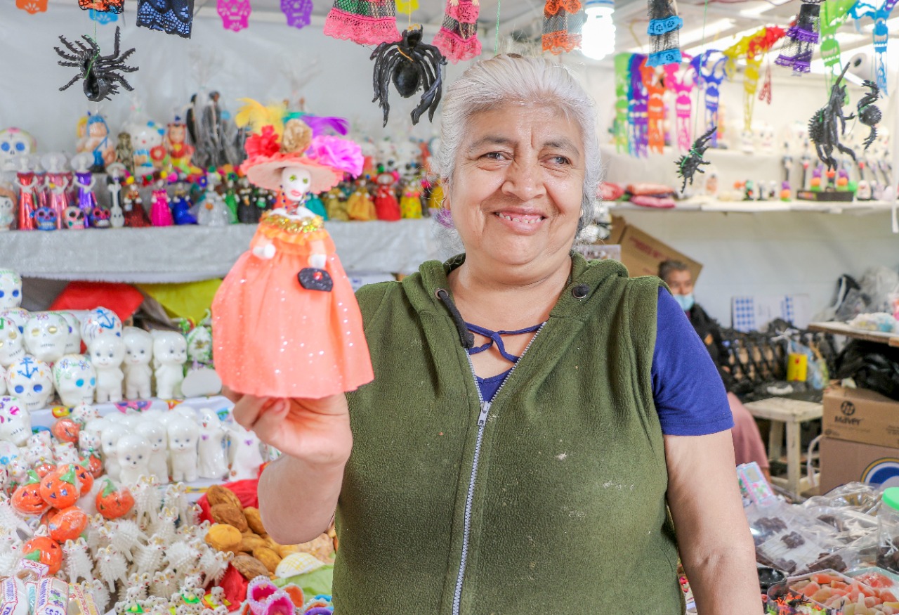 La señora Alberta cuenta que inició vendiendo 30 piezas de sus figuritas y a la fecha elabora de tres mil a cinco mil piezas, siendo la más vendida la catrina que prepara desde diciembre pues confecciona y elabora los vestidos y detalles que llevan las piezas.