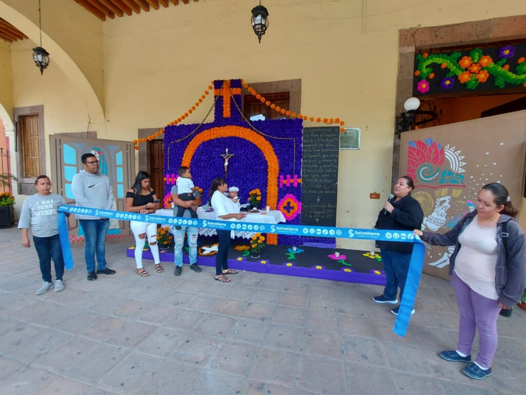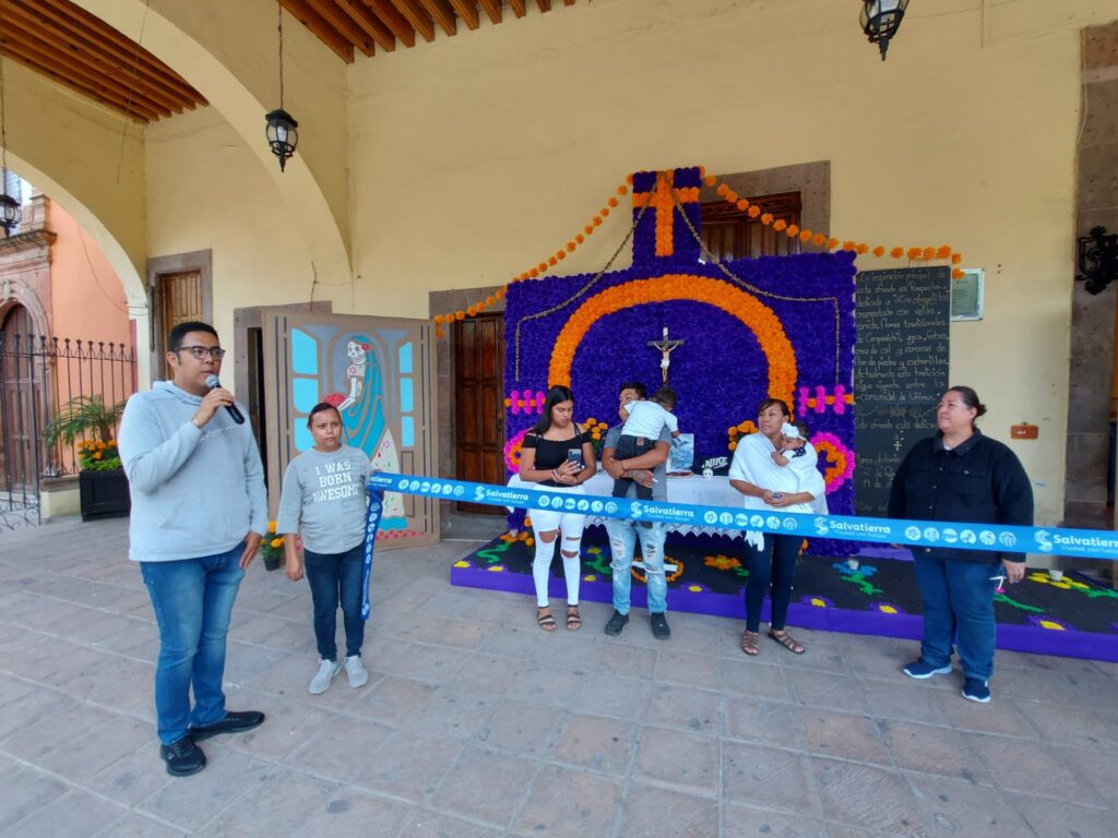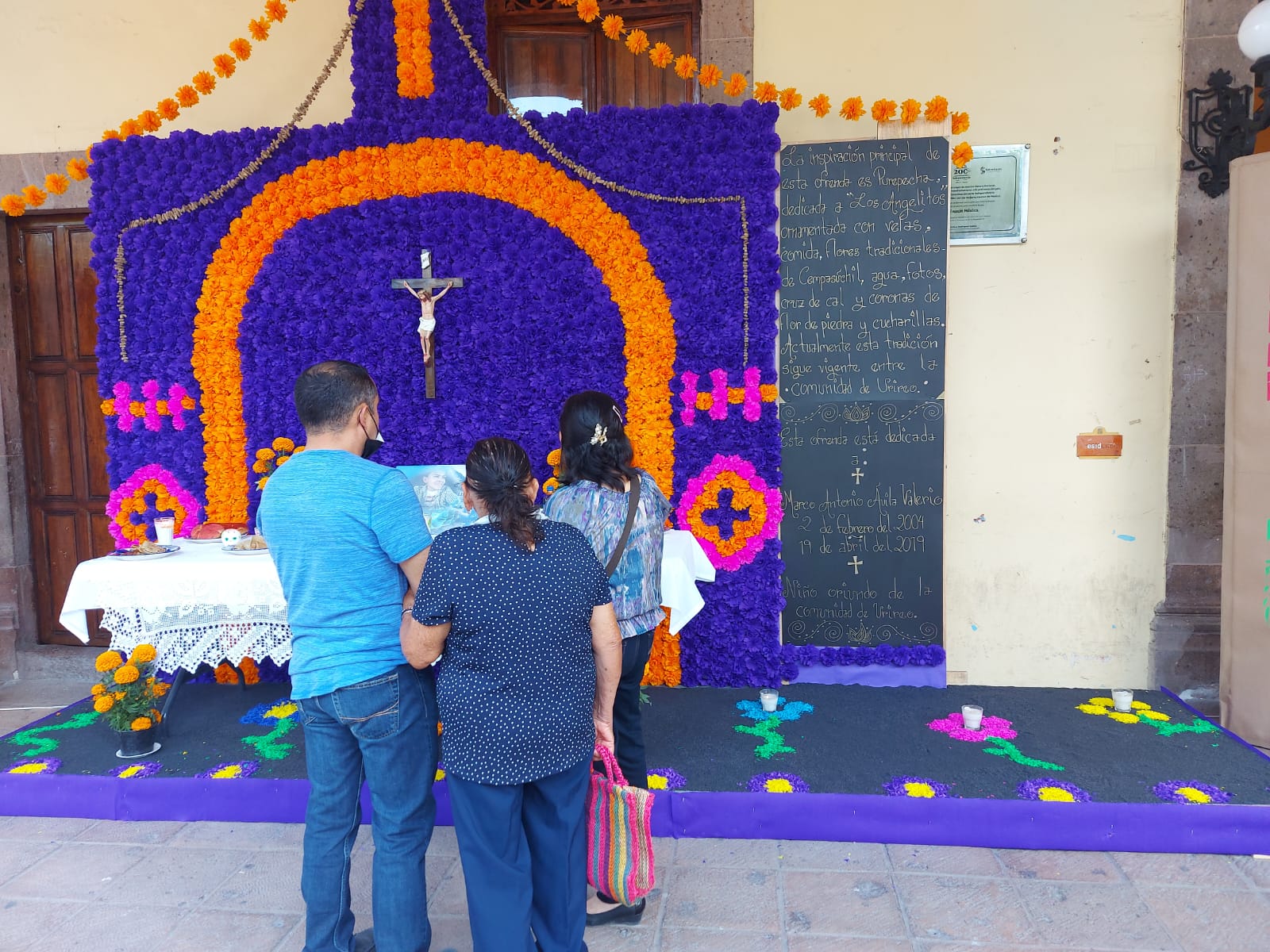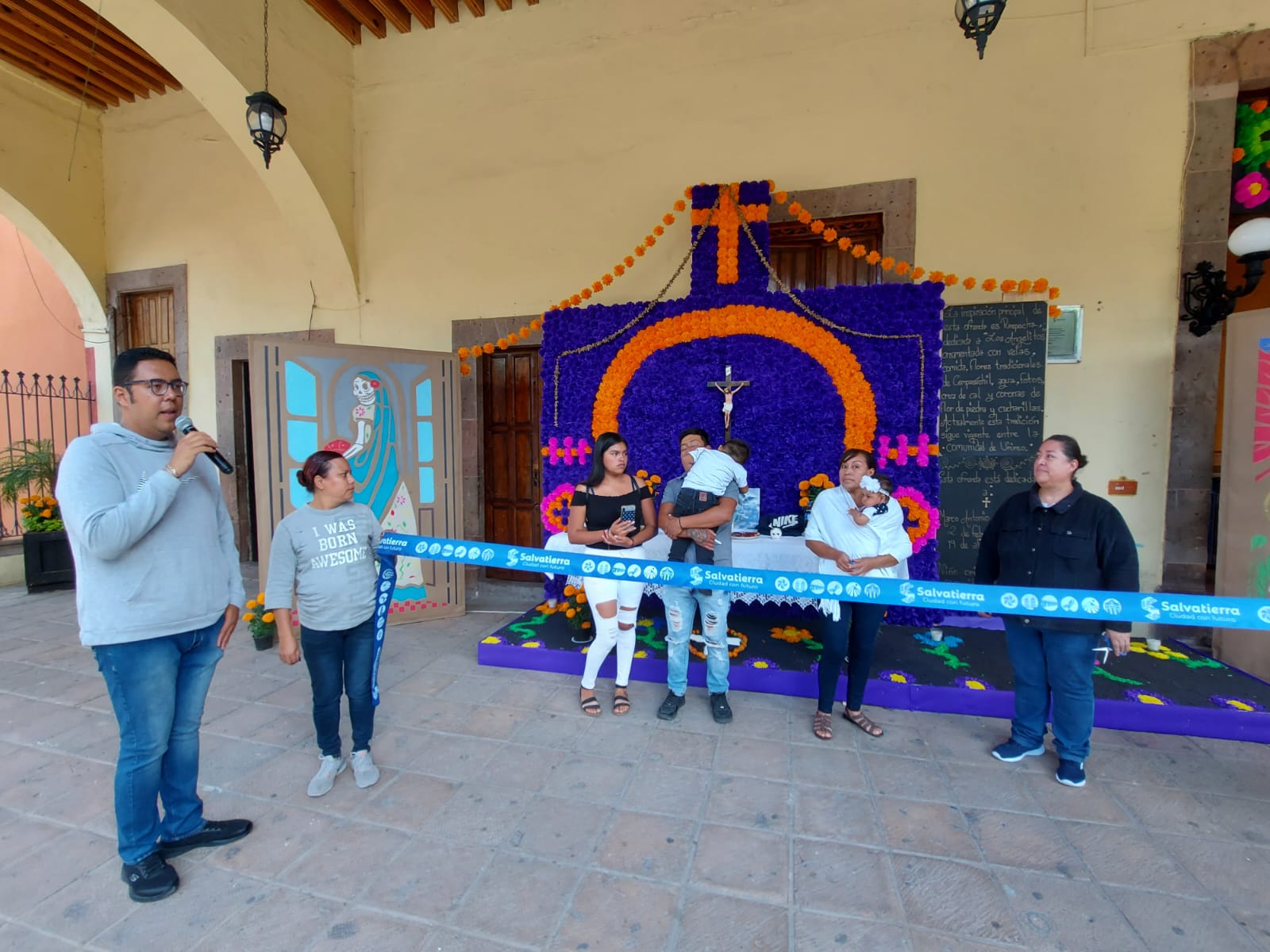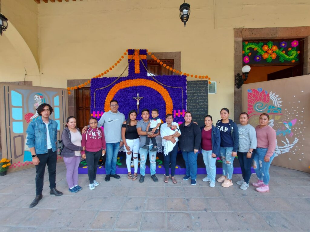 El altar fue creado por el grupo de artesanas “Manos Mágicas” tomando como inspiración la ofrenda Purépecha dedicada a los ángelitos, la cual lleva una ornamenta con velas, comida, flores de cempasúchil, agua, foto de a quien se dedica , cruz de cal, flor de piedra y cucharillas.