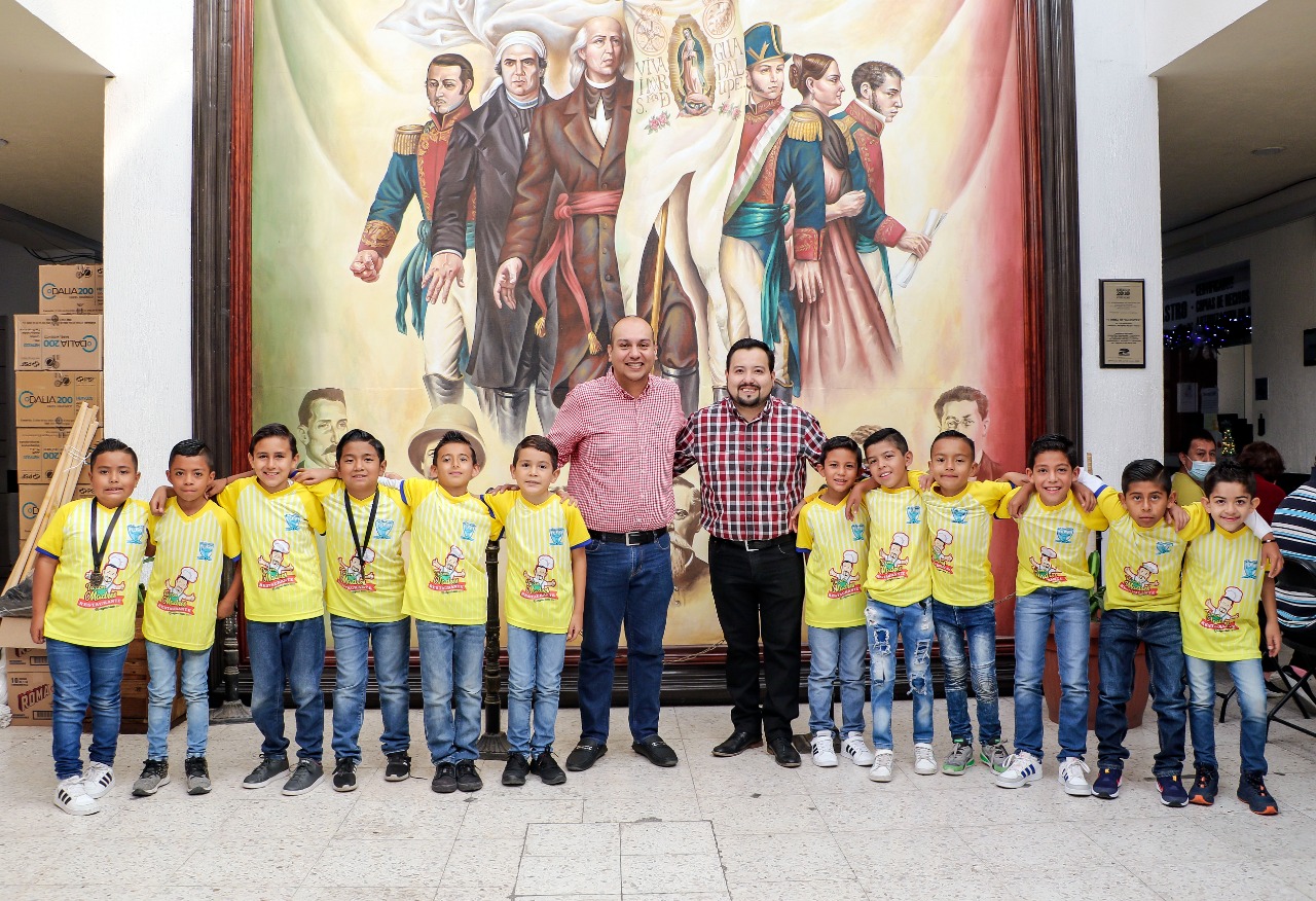 El Presidente Municipal Ariel Corona recibió a 12 niños que forman parte del equipo de futbol Real Cortazar, quienes quedaron campeones en la Copa Celaya 2022.