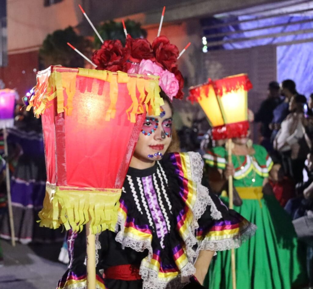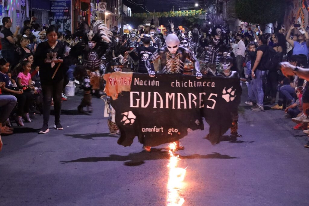 El grupo de danza Guamares, del municipio de Comonfort, abrió el recorrido, al que le siguieron los diferentes contingentes conformados por personas que vistieron espectaculares atuendos, algunos tradicionales como las catrinas, y otros muy vistosos y modernos.