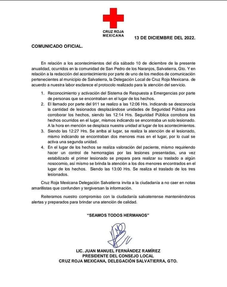 El comunicado donde se desglosa lo acontecido es firmado por el presidente del Consejo de Cruz Roja Mexicana Delegación Juan Manuel Fernández Ramírez