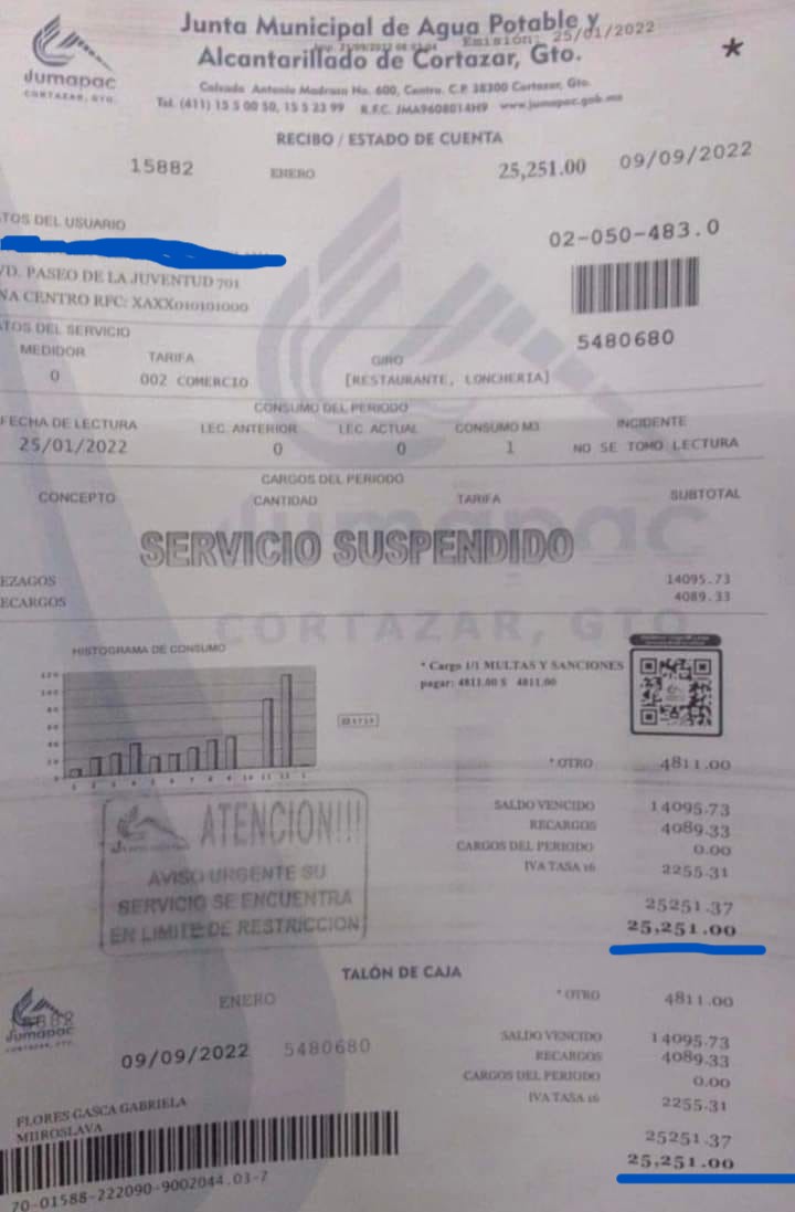 Señalan que la regidora amparada en su posición política, se ha negado a cubrir un adeudo con la Junta Municipal de Agua Potable y Alcantarillado de Cortazar (JUMAPAC) por más de 25 mil pesos por lo que el servicio le fue cortado, sin embargo decidió que en lugar de cumplir con esta obligación tributaria, como todo ciudadano, compraría servicio de agua potable a domicilio (pipas) cancelando también el servicio de descarga de aguas residuales, contemplado en la ley.