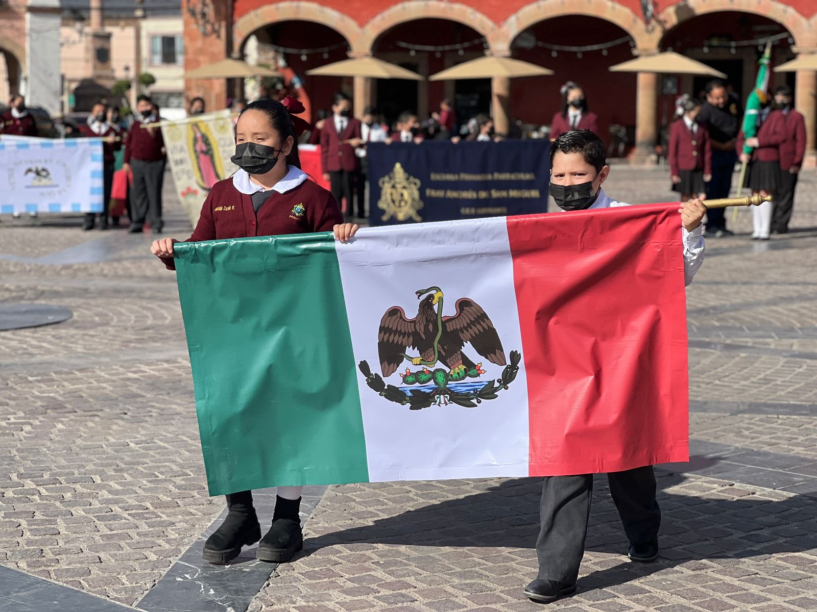 Así mismo la Historiadora Rosario Orzoco Mosqueda dio una reseña histórica de la fecha y alumnos de primaria del Complejo Educativo Fray Andrés de San Miguel mostraron las diferentes banderas mexicanas que se han tenido a través del tiempo.