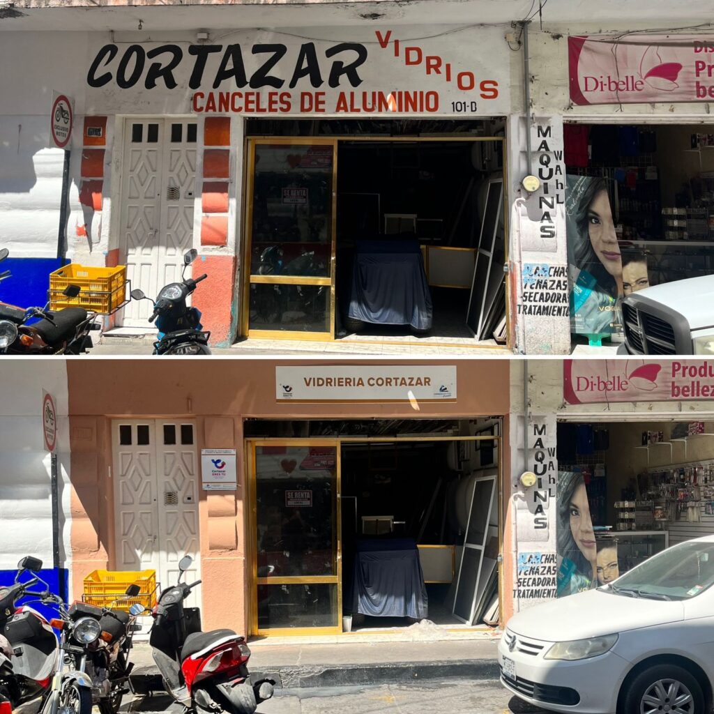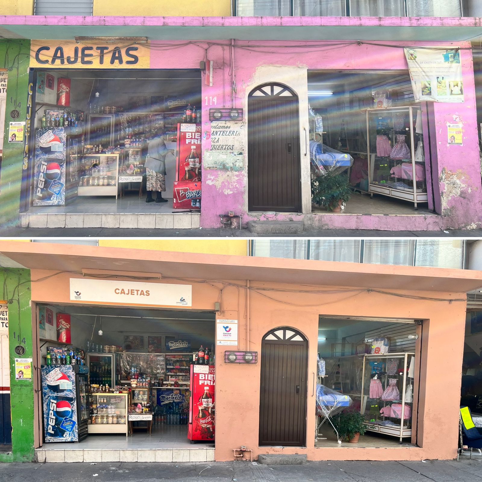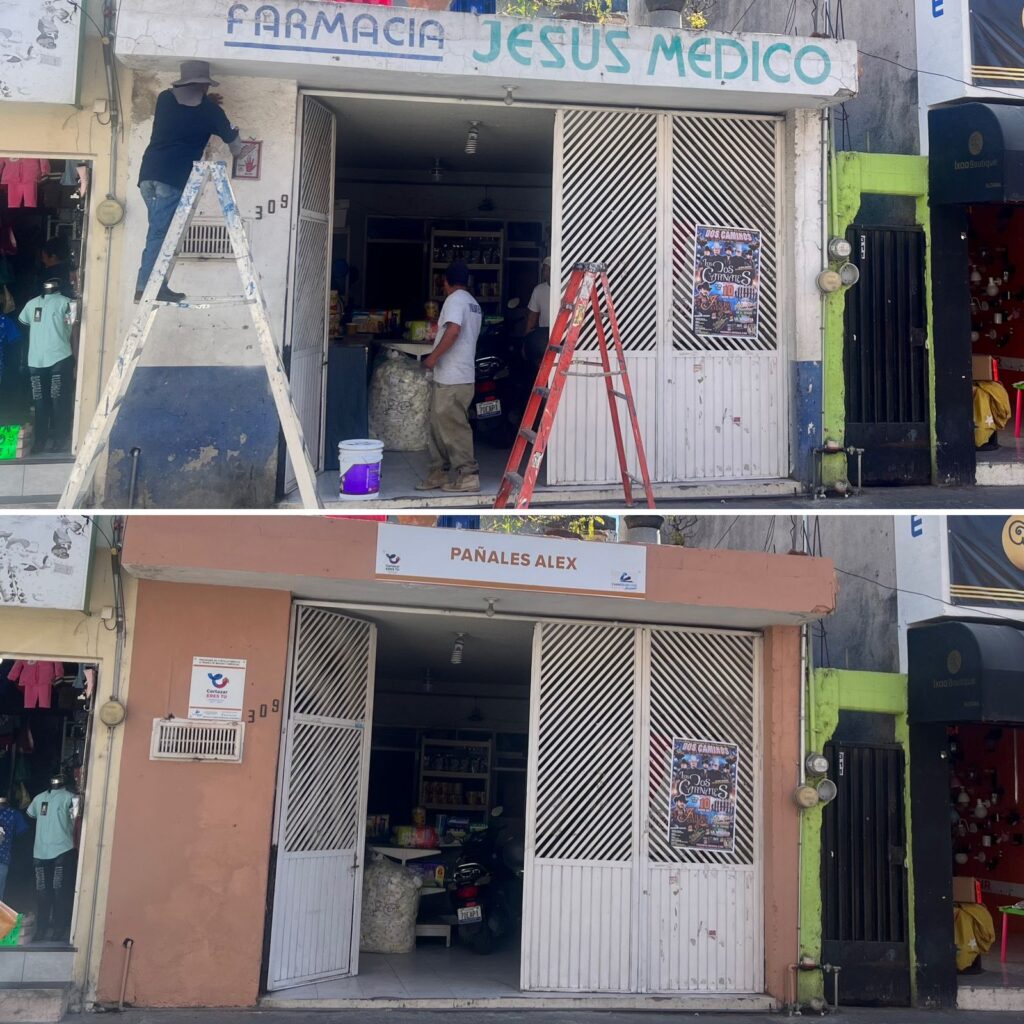 Para la entrega se realizó un análisis de los comercios ubicados en calles con mayor afluencia de personas, a los que se les realizó la pinta de fachada y la colocación de letreros.
