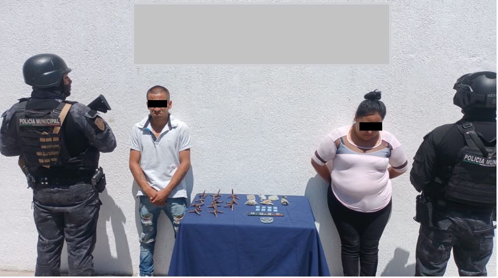 Finalmente, personal de Policía Municipal detuvo a una mujer y un hombre en posesión de 8 bolsas de plástico con sustancia granulada con características propias del Cristal y 7 bolsas de plástico transparentes con hierba seca en su interior de características propias de la Marihuana, asimismo se localizó dentro de un vehículo 11 estructuras metálicas tipo estrella mejor conocidas como “Poncha Llantas”.