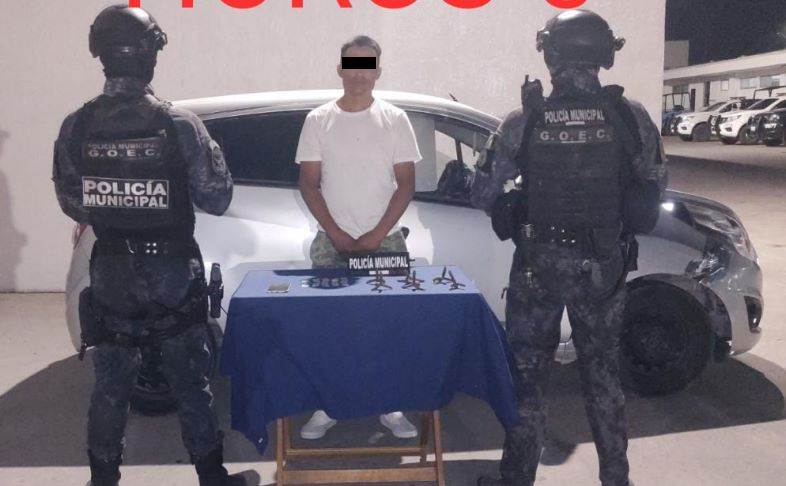En otro hecho sobre la colonia Geovillas se detuvo a un hombre en posesión de 20 bolsas de plástico con una sustancia granulada de características propias del Cristal; además de 6 estructuras metálicas tipo estrella conocidas como “Poncha Llantas”.
