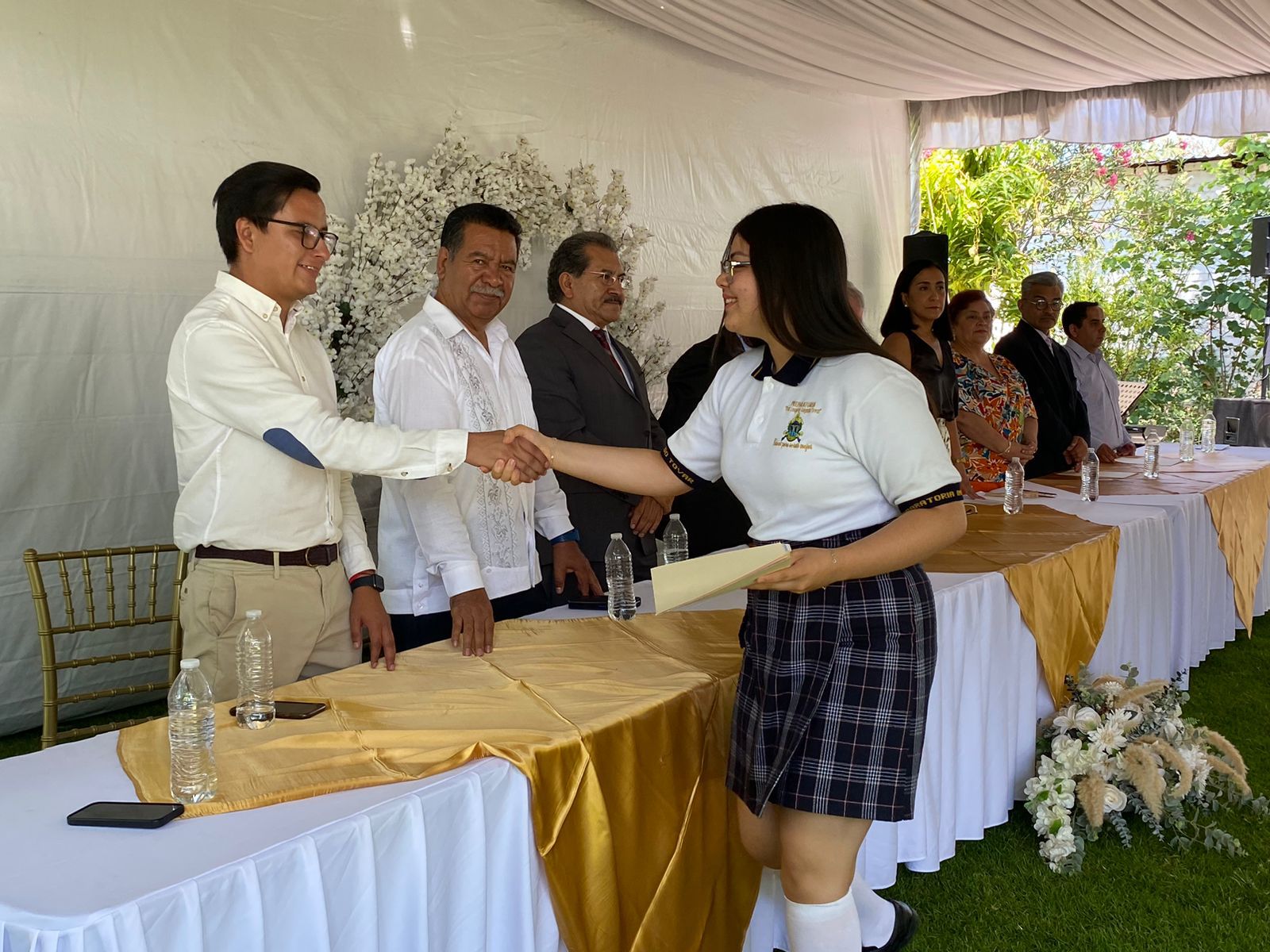 El presidium estuvo conformado por el Coordinador de Educación del municipio, Salvador Lara Rodríguez; el Director General del Complejo Educativo Fray Andrés de San Miguel, Tarcisio Salgado Tovar; la Directora de la preparatoria Leopoldo Salgado Tovar, Margarita Montoya López; así como personal administrativo y docente.