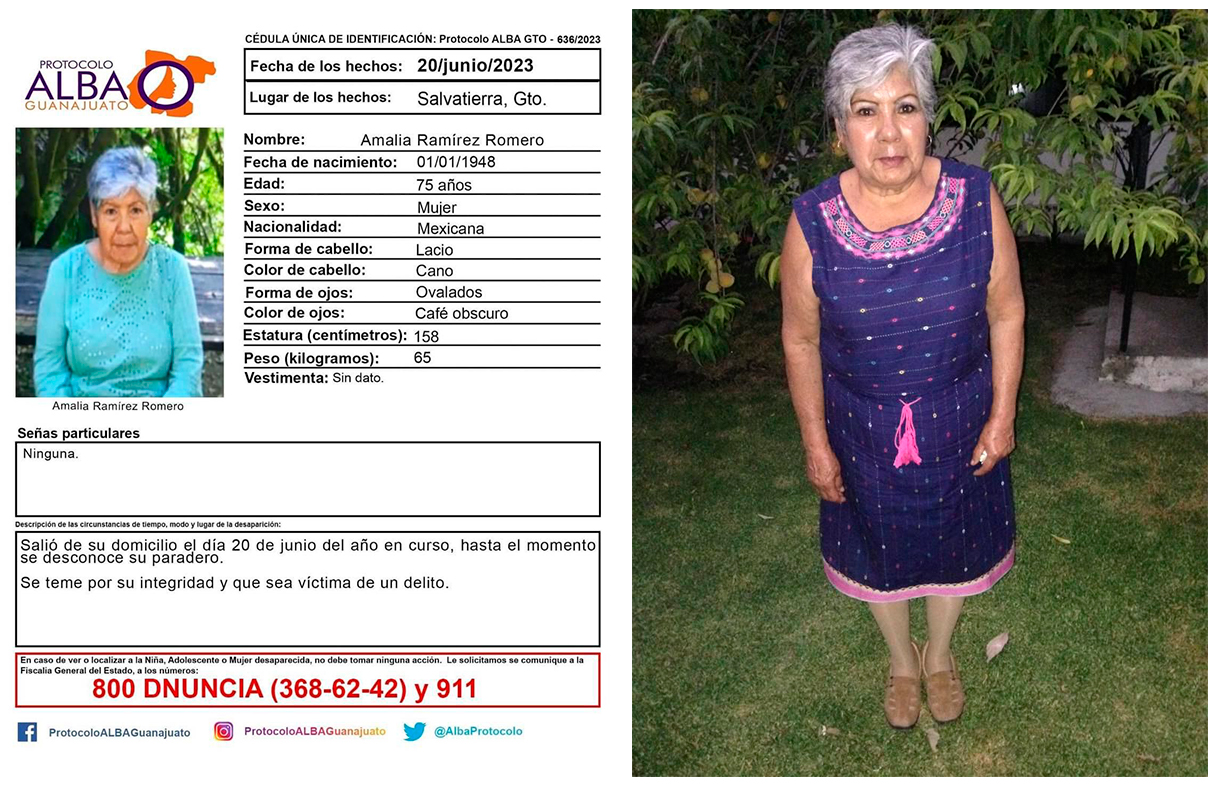 La señora Amalia Ramírez Romero de 75 años de edad cuenta con cédula única de identificación de Protocolo ALBA Guanajuato 636/2023 luego de que sus familiares reportaron su desaparición desde el pasado 20 de junio del presente año.