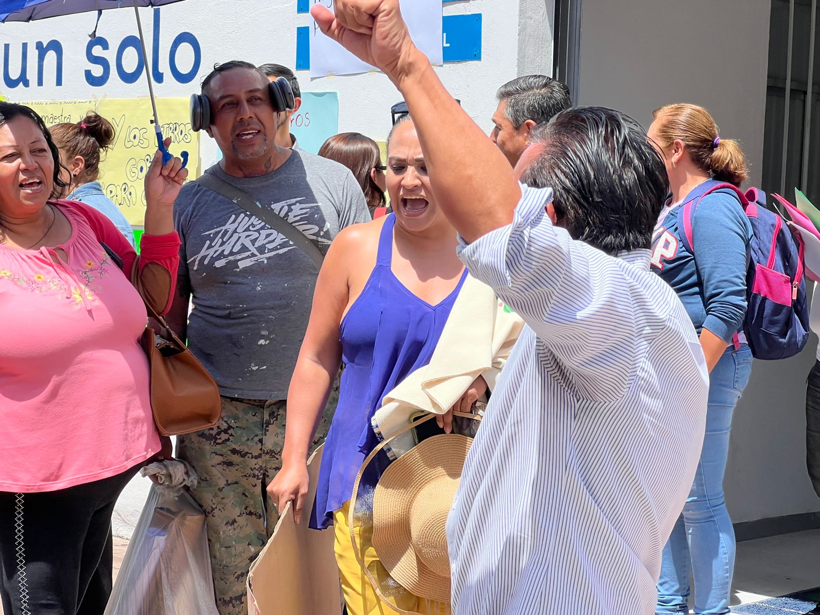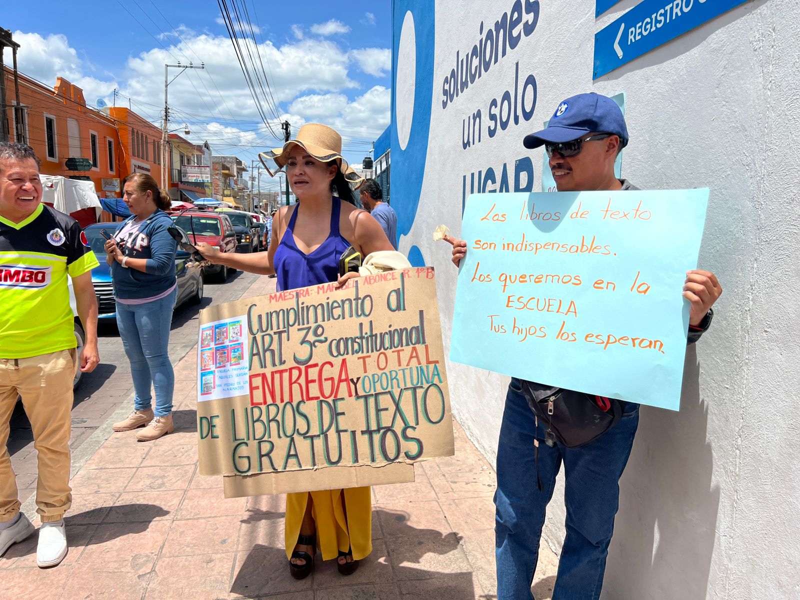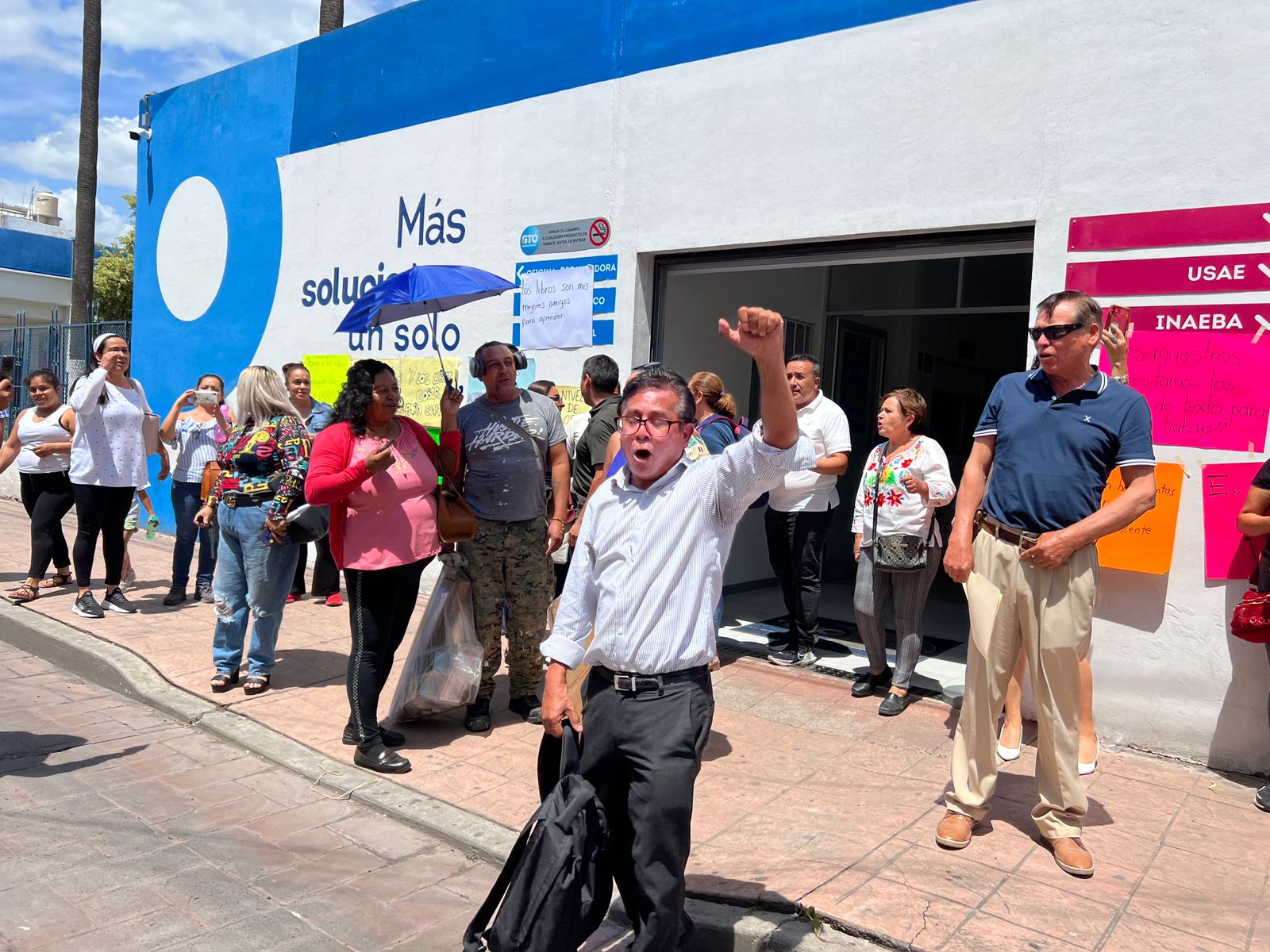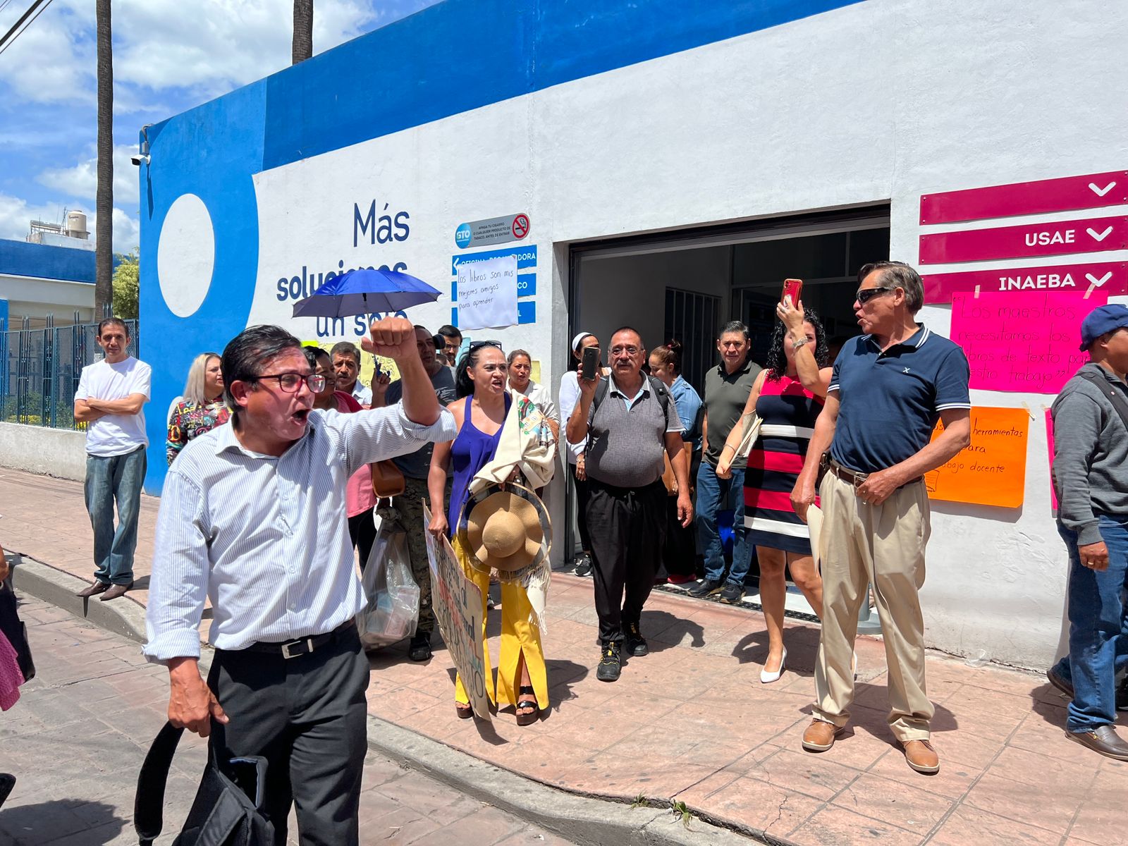 Decenas de maestros de nivel primaria y secundaria acudieron a la convocatoria para realizar una manifestación en las instalaciones de USAE ubicada sobre la calle Ocampo esquina con Rivapalacio para exigir la entrega de los libros de texto previo al inicio del nuevo ciclo escolar.
