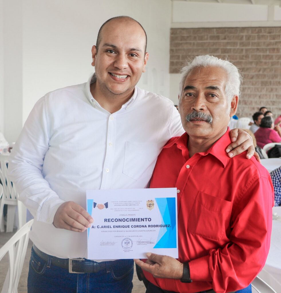 En el marco del Día del Comerciante, Integrantes de la Unión de Comerciantes Ambulantes, Fijos y Semifijos, Comestibles y Varios “Antonio Sánchez Aboytes A.C.”, recibieron de manos del Presidente Municipal, Ariel Corona Rodríguez, un reconocimiento por su trayectoria al servicio de la población.