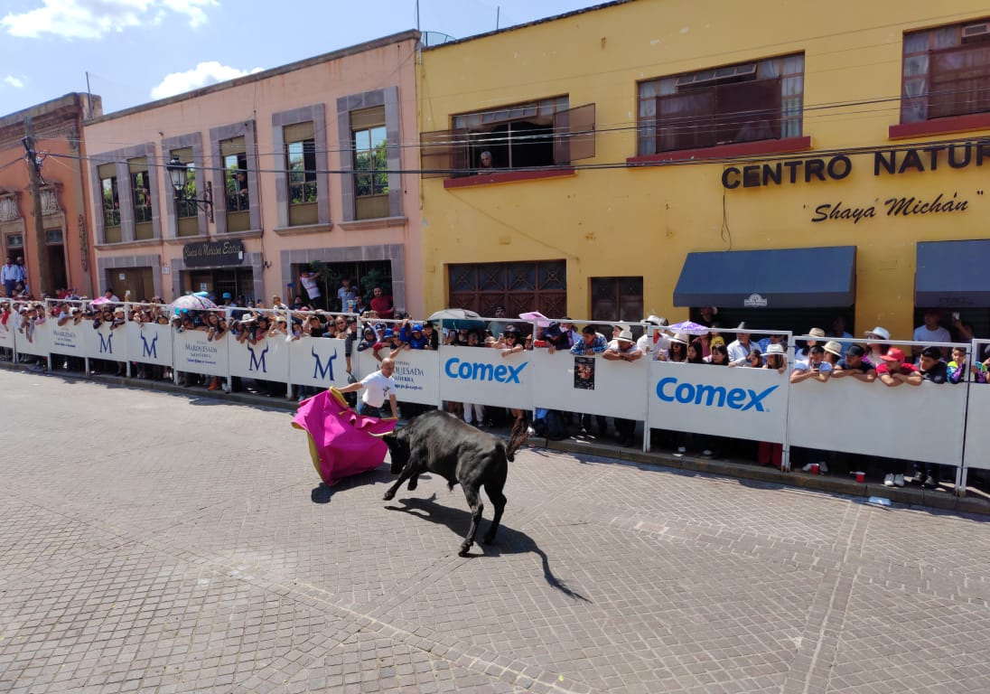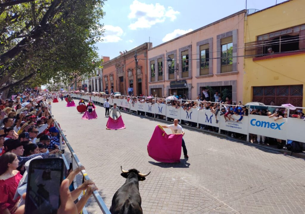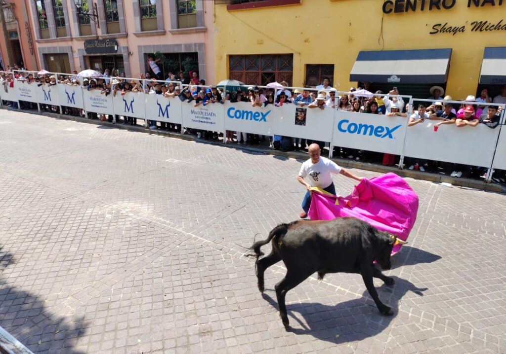 Ya en la tarde en la calle Benito Juárez se realizó por segundo año consecutivo el encierro de toros infantil en donde decenas de menores de edad vivieron una experiencia taurina corriendo de toros inflables, conviviendo de manera armónica y llenos de alegría.
