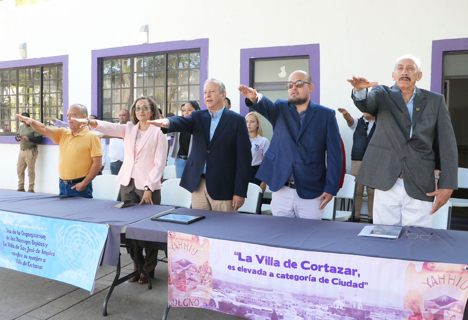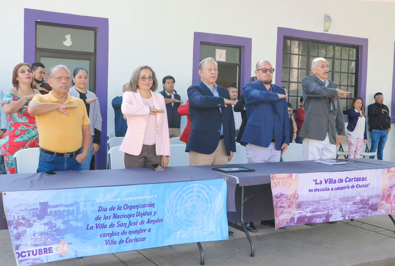 Autoridades municipales en conjunto con personal docente y alumnos de la Escuela Primaria J. Jesús Macías Garma, participaron en un acto cívico para conmemorar el 78 aniversario de la fundación de la Organización de las Naciones Unidas, y el 166 aniversario del cambio de nombre de San José de los Amoles a Villa de Cortazar, en las instalaciones del Centro Cultural Cortazar.