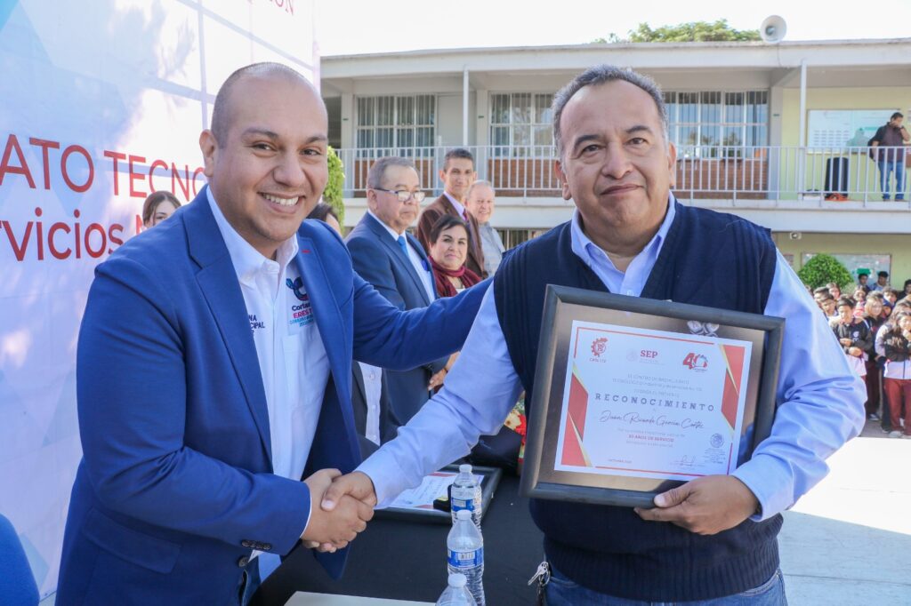 Con 10 años de trayectoria, recibieron reconocimiento Jairo Conde y Bulmaro Jilote Gasca; con 20 años de trayectoria, fue condecorado Salvador Mesa Tapia; con 30 años de labor, recibieron reconocimiento Claudia Alejandra Silva, Juan Ricardo García Cortés, y Benito Juárez León. Por su parte, Agustín Ramírez Ramírez, recibió mención honorífica por 40 años de labor ininterrumpida dentro del p´lantel educativo.