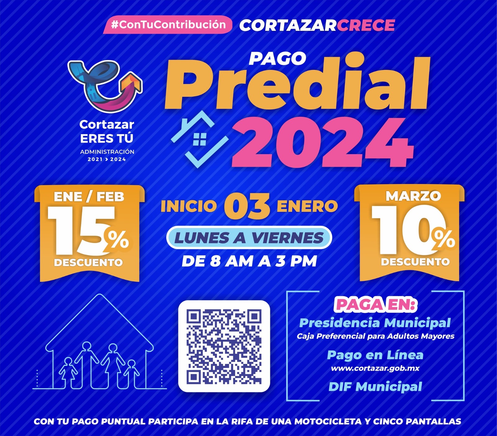 Para realizar el pago de impuesto predial, los ciudadanos pueden dirigirse a las instalaciones de Presidencia Municipal, así como del Sistema DIF Municipal, en horario de 8:30 de la mañana a 3:00 de la tarde. También pueden realizar su pago en línea a través de la siguiente liga: https://cortazar.gob.mx/index.php/pago-predial/ ,o bien acceder a través del código QR que se encuentra en módulos de información instalados en Presidencia Municipal y distintos accesos de oficinas de la administración municipal.