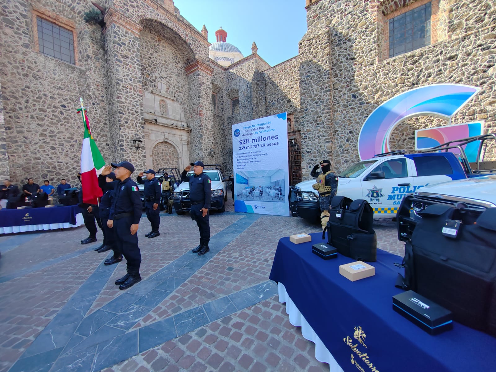 De igual forma gracias al cumplimiento de los compromisos con la Secretaría de Seguridad Pública del Estado de Guanajuato y como participes del Fondo Estatal Para el Fortalecimiento de Seguridad Pública se realizó la entrega de: 3 nuevas unidades Ram, 1500, doble cabina y otra camioneta Frontier doble cabina, así como 10 bicicletas, 6 chalecos anti balas, equipos de radio comunicación y cámaras portátiles de solapa esto con una inversión de $ 4,481,620.00