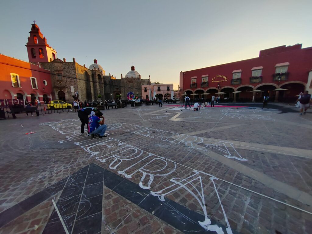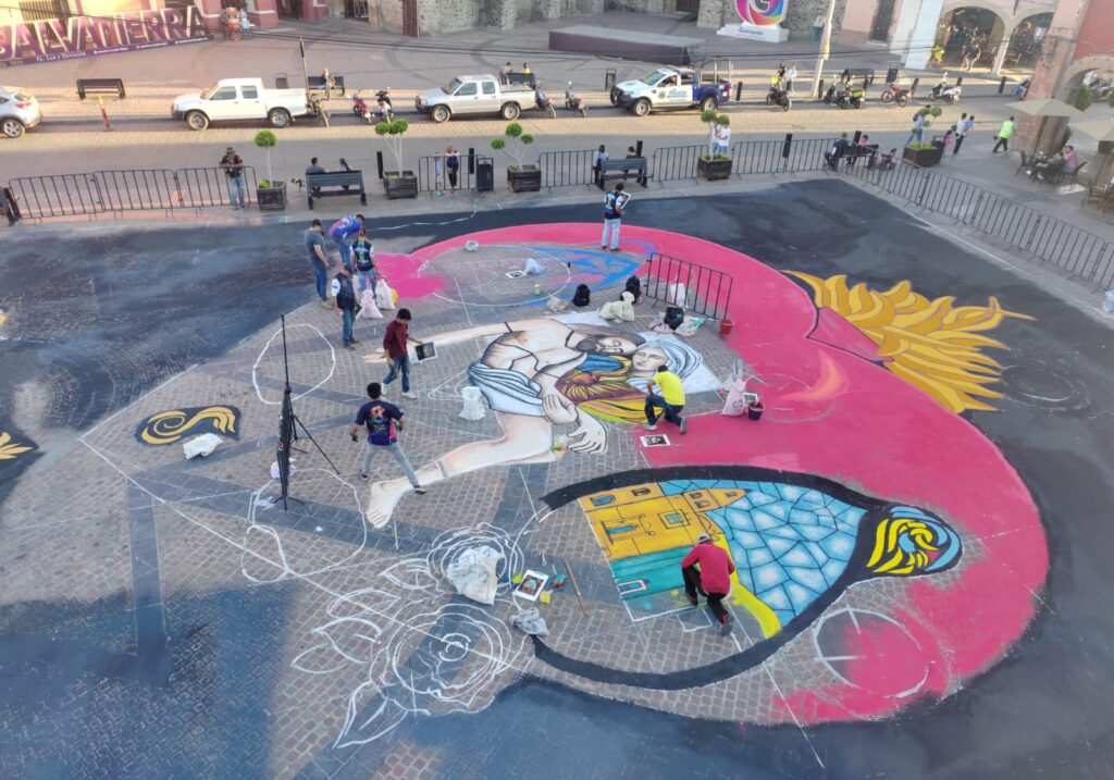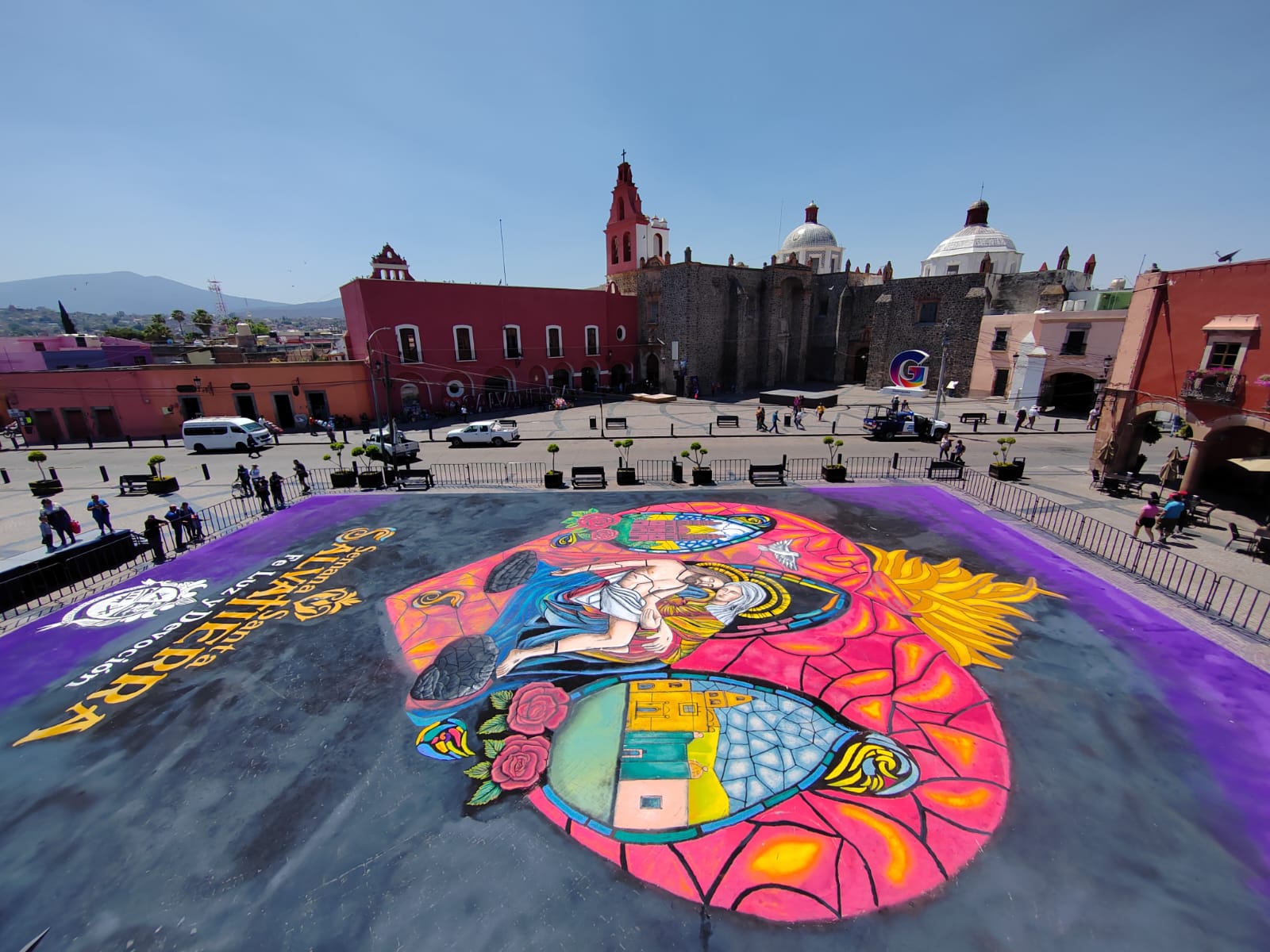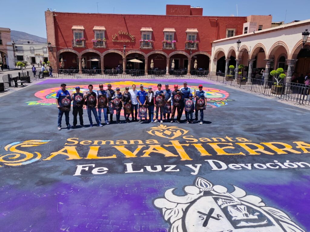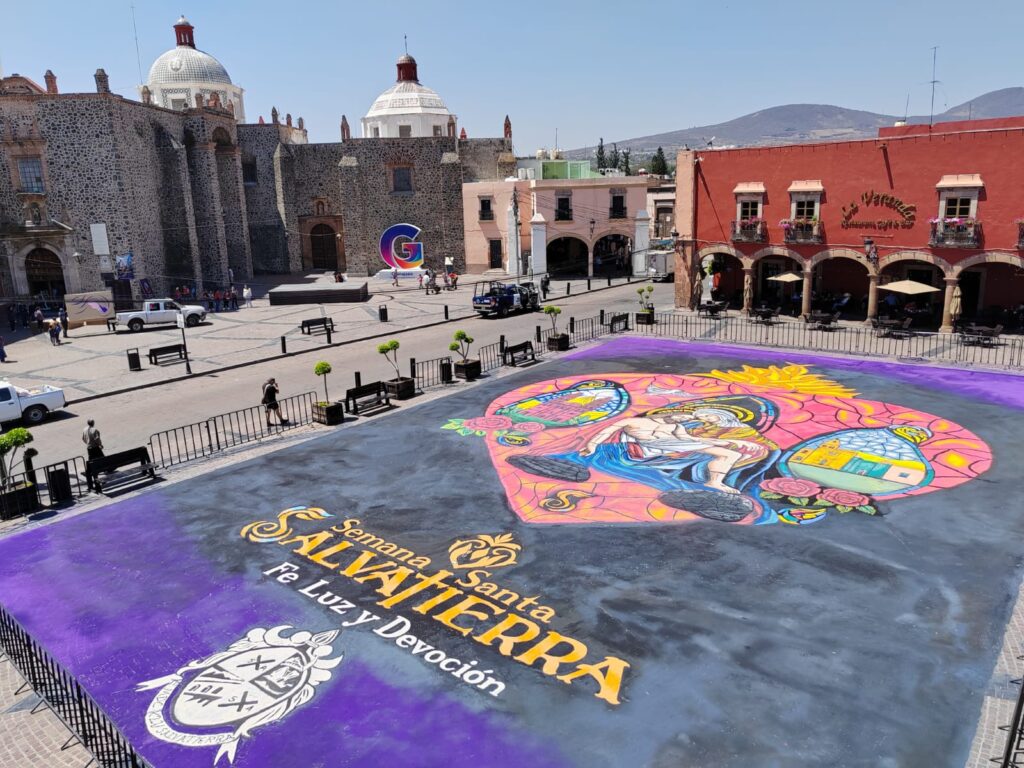 Por segundo año consecutivo los salvaterrenses y turistas pueden admirar el tapete monumental de arte efímero elaborado por la asociación civil de alfombristas tapeteros de la ciudad de Uriangato.