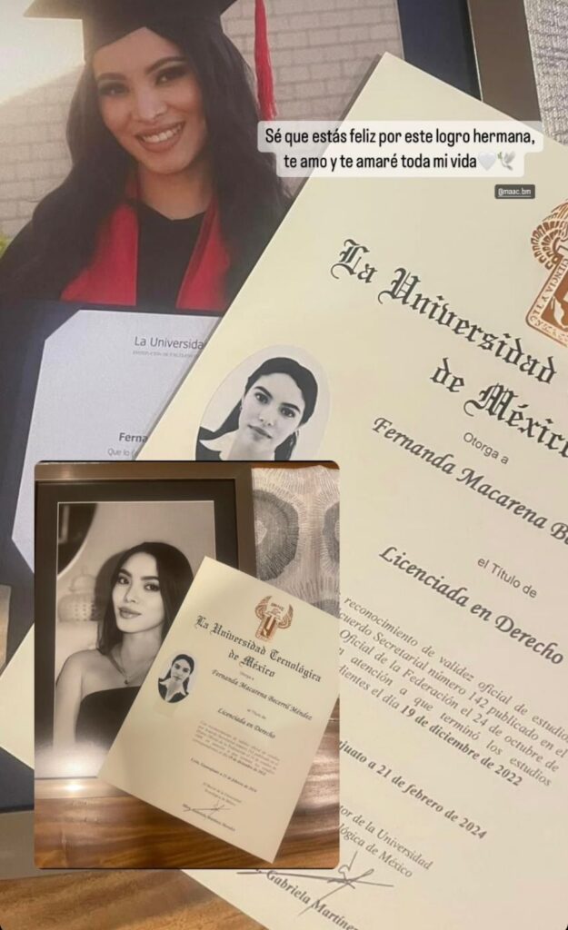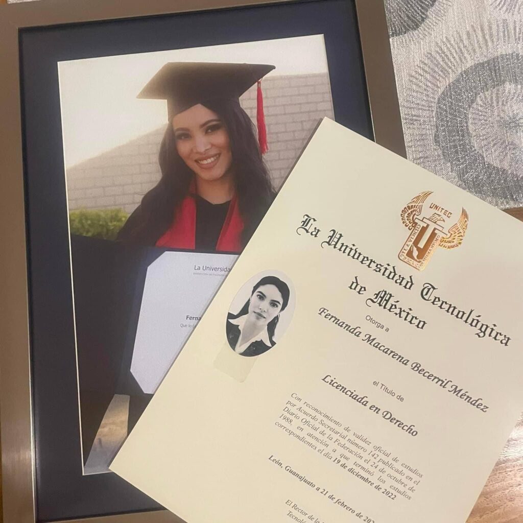 Ayer, la familia de Fernanda recibió un reconocimiento especial de la Universidad Tecnológica de México: el título universitario de Fernanda Becerril de manera póstuma. A sus 25 años, Fernanda había concluido la licenciatura en derecho.