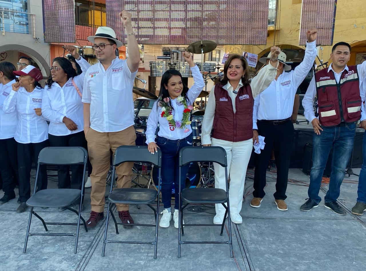 Cinthia estuvo acompañada en su recorrido por varias calles para saludar a la gente en sus hogares, por Alma Alcaraz, candidata a la gubernatura y de Ernesto Prieto, aspirante a la diputación federal, y al finalizar, “clausuraron” simbólicamente la presidencia municipal.