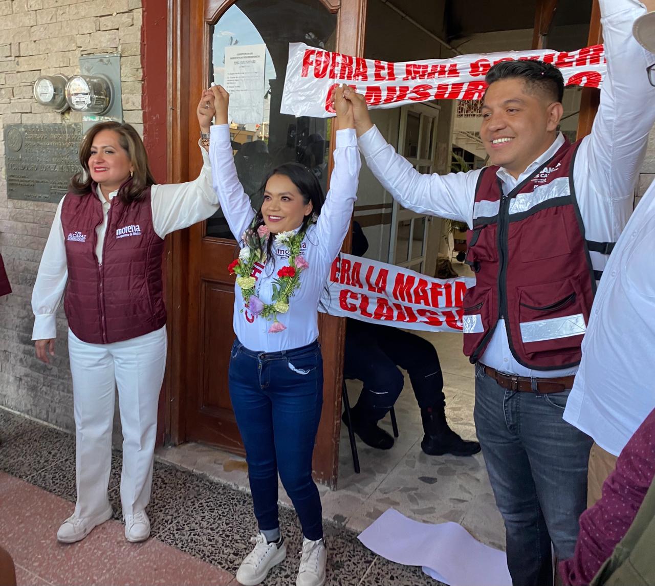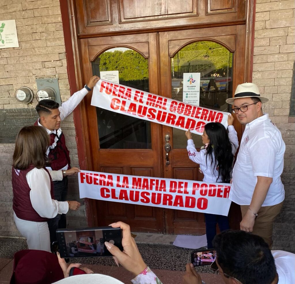 Al clausurar simbólicamente la presidencia municipal, por la candidata Cinthia, auxiliada por su esposo el diputado Emmanuel Reyes, y también Alma Alcaraz, se señaló en las cintas blancas con letras rojas, “Fuera el mal gobierno” y “Fuera la mafia del poder”.