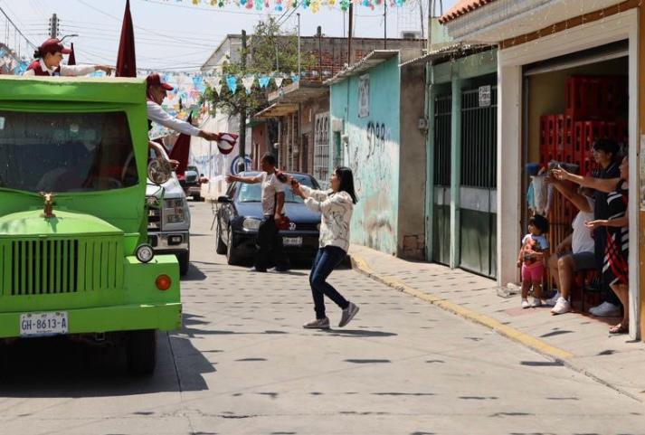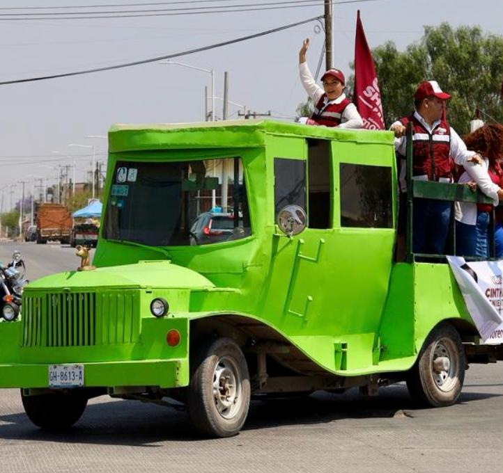Era color verde en forma de una máquina de tren, que llamó la atención de los viandantes, por las calles que recorrieron en la zona urbana y algunas colonias populares, en las que muchas personas manifestaron el apoyo a Cinthia, a quien ya conocen por sus actividades de ayuda a la gente.