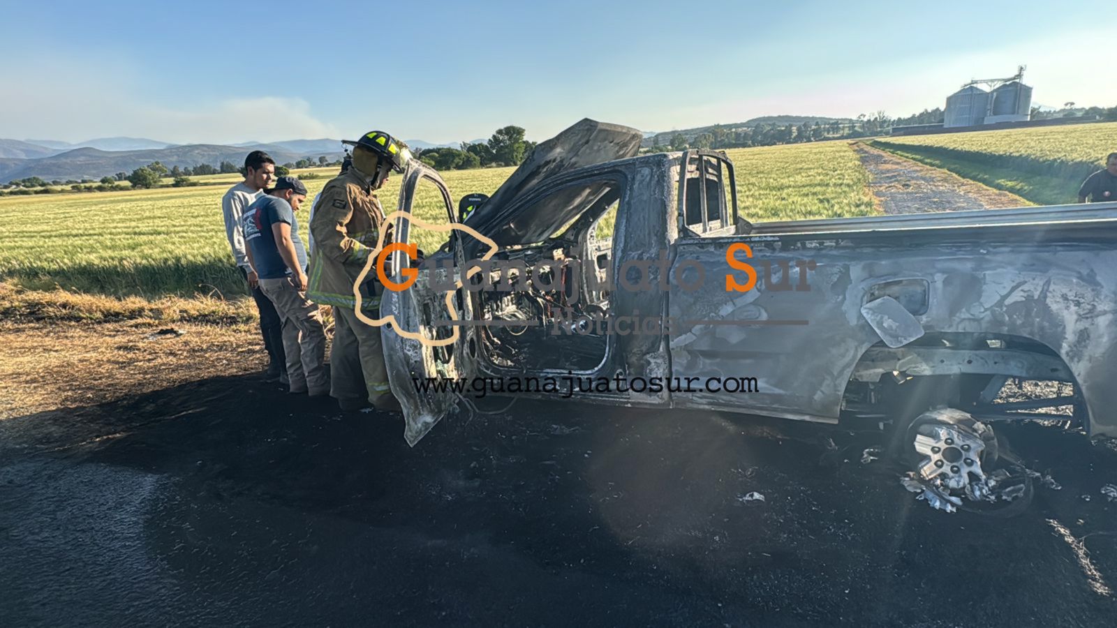 A pesar de los esfuerzos de los elementos y los Bomberos Voluntarios de Acámbaro, el fuego consumió por completo la camioneta, dejando solo el cascarón.