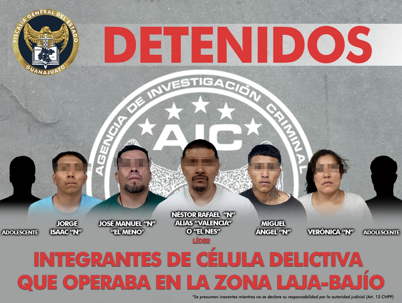 Los detenidos son: Néstor Rafael “N” alias “Valencia” o “El Nes”, quien fungía como líder, José Manuel “N” alias “Meño”, Miguel Ángel “N”, Verónica “N”, Jorge Isaac “N” y dos adolescentes.