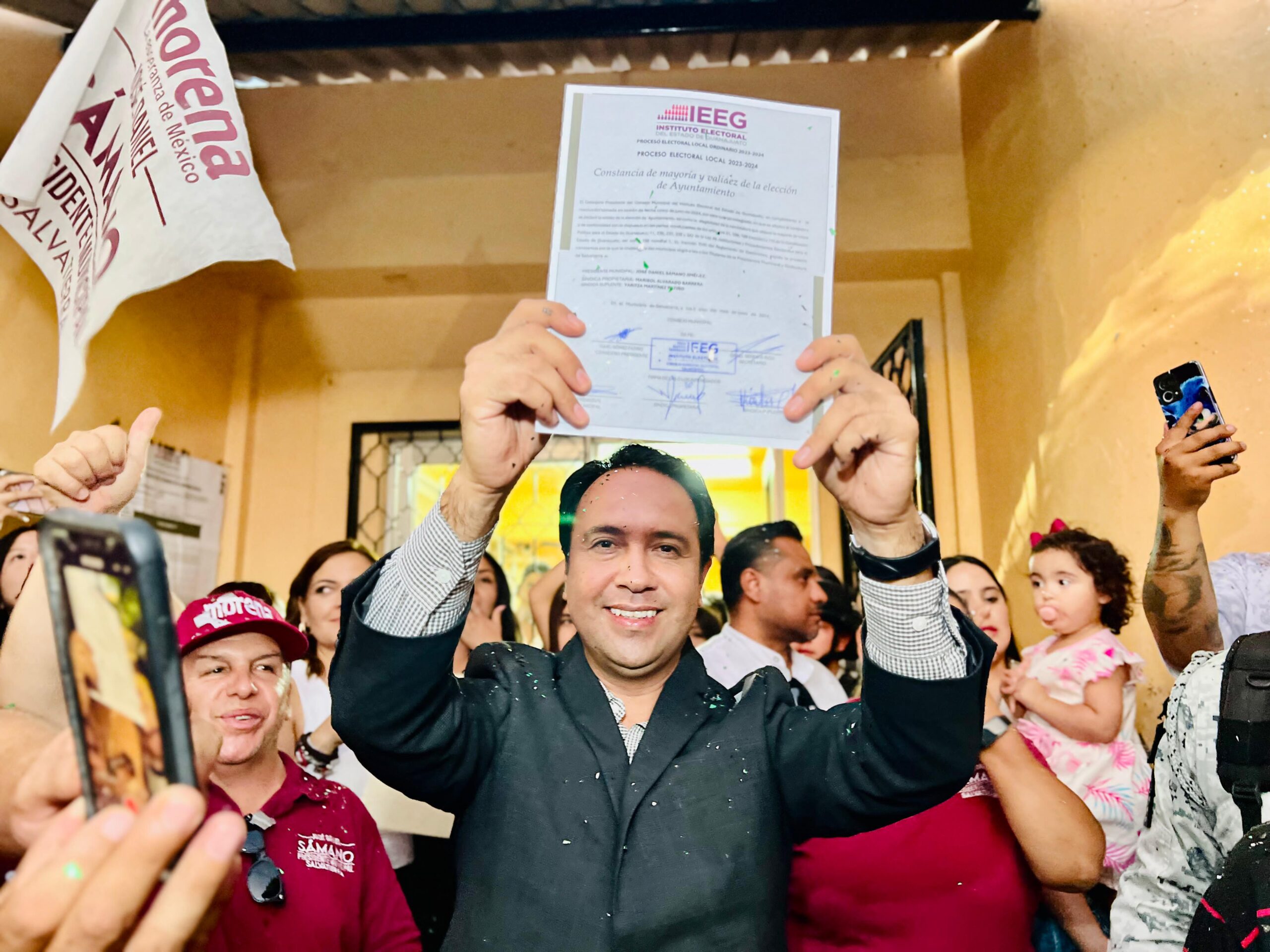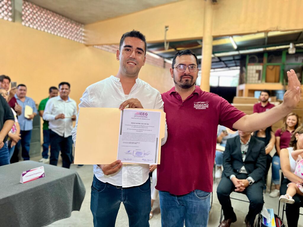 A las 6:30 de la tarde de este miércoles, Sámano Jiménez, junto con su planilla ganadora, acudió a su cita con la mesa directiva del Instituto Electoral del Estado de Guanajuato (IEEG) en Salvatierra. Isaac Gómez Patiño, presidente del IEEG, entregó la constancia de mayoría de votos al presidente Electo José Daniel Sámano Jiménez; Marisol Alvarado Barrera, Síndico Municipal; Rafael García del Horno, primer regidor; Rosa Elvira López Jiménez, segunda regidora; Javier Cardoso López, tercer regidor; Nancy López Montes, cuarta regidora; Jorge Alfonso Villaseñor Ruiz, quinto regidor; y María Isabel Contreras Rodríguez, sexta regidora.