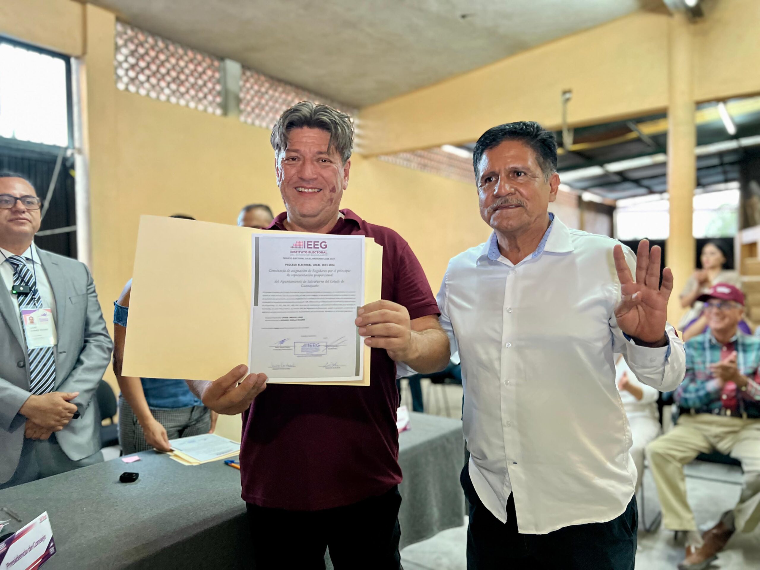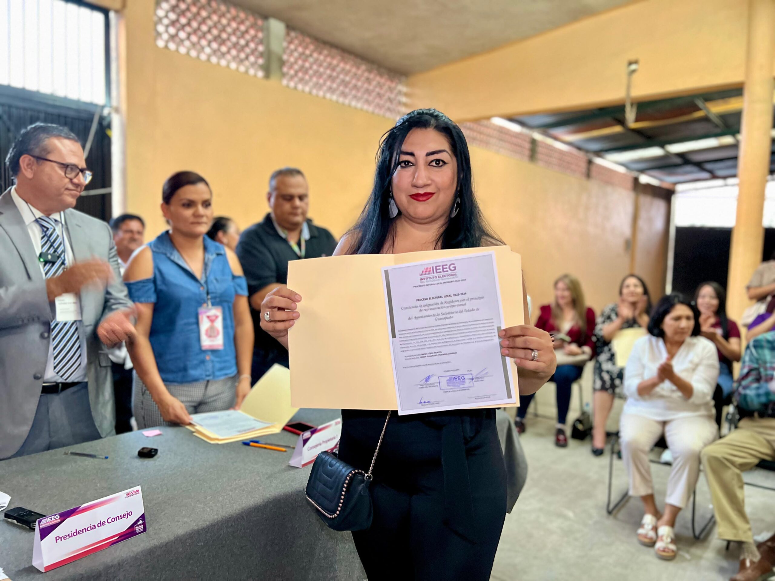 A las 6:30 de la tarde de este miércoles, Sámano Jiménez, junto con su planilla ganadora, acudió a su cita con la mesa directiva del Instituto Electoral del Estado de Guanajuato (IEEG) en Salvatierra. Isaac Gómez Patiño, presidente del IEEG, entregó la constancia de mayoría de votos al presidente Electo José Daniel Sámano Jiménez; Marisol Alvarado Barrera, Síndico Municipal; Rafael García del Horno, primer regidor; Rosa Elvira López Jiménez, segunda regidora; Javier Cardoso López, tercer regidor; Nancy López Montes, cuarta regidora; Jorge Alfonso Villaseñor Ruiz, quinto regidor; y María Isabel Contreras Rodríguez, sexta regidora.