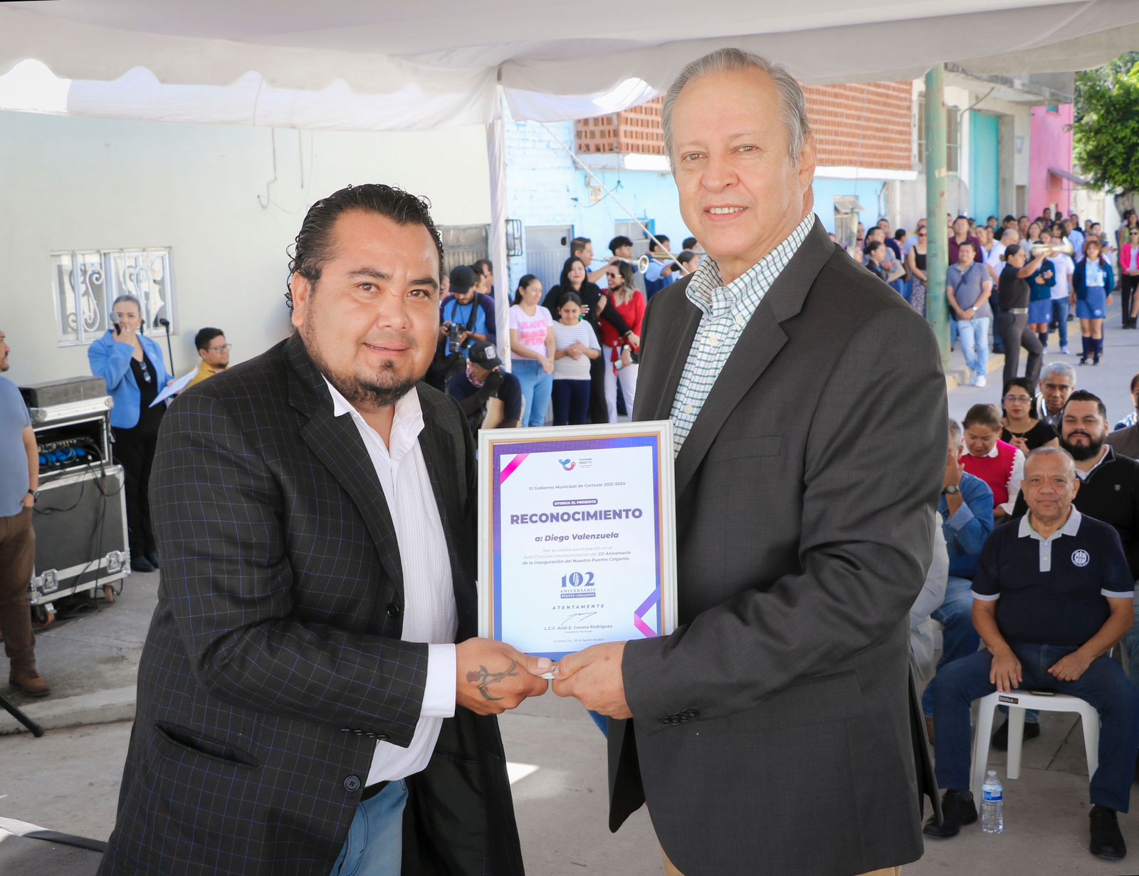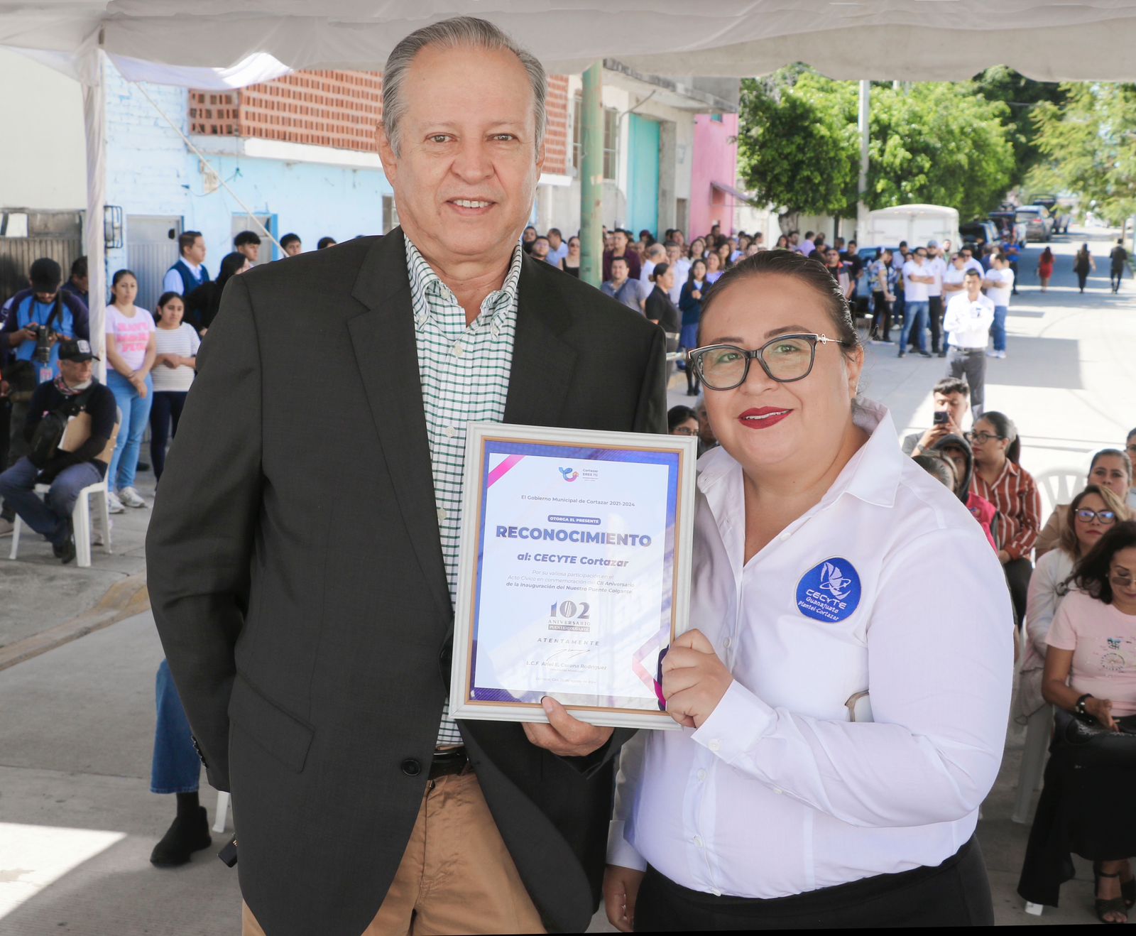 Posteriormente, Perea Castro, en compañía de autoridades municipales, entre las que se encontraban la Contralora Municipal, Ana María Razo Rodríguez; el Director del Sistema de Seguridad Pública Municipal, Fernando Escalera; el Oficial Mayor, Martín Rosiles; el Cronista Municipal, Jorge Vera Espitia; el Director de Tránsito y Movilidad, Alejandro Laguna; el Director de Ecología; Alfonso Nava; y la profesora Alejandra Troncoso Patiño, en representación de la directora de CECyTE plantel Cortazar, María Teresa Méndez Rosas, hizo entrega de reconocimientos a participantes y el evento concluyó con la toma oficial de fotografía por la conmemoración del monumento artístico.