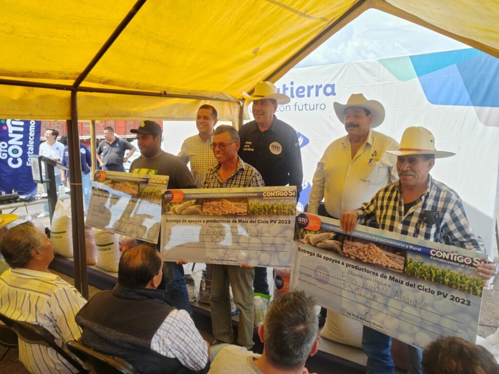 El Presidente Municipal Germán Cervantes Vega y Paulo Bañuelos Rosales titular de la Secretaría de Desarrollo Agroalimentario y Rural realizaron la entrega de órdenes de pago de maíz a 23 unidades de producción de diferentes comunidades de Salvatierra, esto con el objetivo de fortalecer el resultado desfavorable del proceso de comercialización de dicho producto durante el ciclo primavera – Verano2023, derivado de fluctuaciones de mercado adversas. Invirtiéndose en ello más de $329,000 pesos.