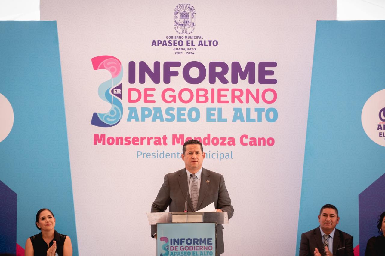 Fue durante la gira de trabajo del Gobernador del Estado de Guanajuato, Diego Sinhue Rodríguez Vallejo, que Monserrat Mendoza Cano, presentó su tercer informe de Gobierno, en la que además aprovechó para la entrega de equipamiento a elementos de la Dirección de Seguridad Pública y la modernización del C4, en la que accedieron a programas por un monto mayor a los 52 millones de pesos, además del arranque de la colocación de la primera piedra de la casa del jubilado, con un monto de más de 4 millones de pesos.