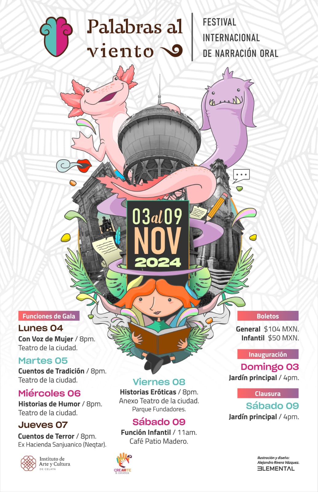 El Festival “Palabras al Viento”, en colaboración con el Instituto de Arte y Cultura Celaya, llevarán a cabo la edición número 16 de este tradicional evento, del 3 al 9 de noviembre próximos. Las sedes serán el Teatro de la Ciudad, Ex Hacienda San Juanico (Néctar), Parque Fundadores 450, café Patio Madero y el jardín principal.