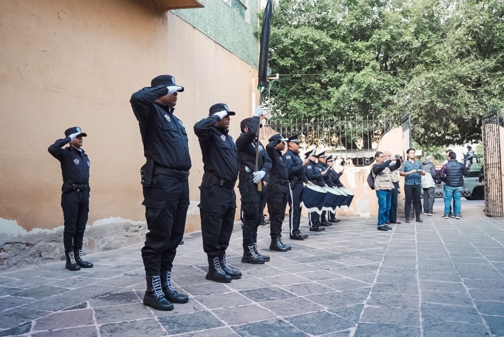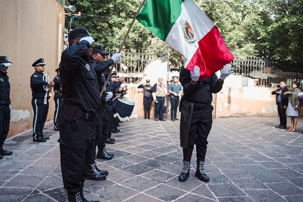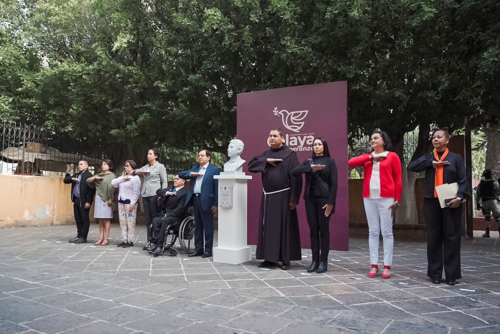Se realizaron honores a la bandera acompañados de la banda de guerra de la Policía Municipal y la escolta del Instituto de Formación Policial, para posteriormente dar paso a una reseña de doña Emeteria Valencia por parte de la directora del Instituto Municipal de las Mujeres de Celaya, Alma Guadalupe Virgen Salazar.
