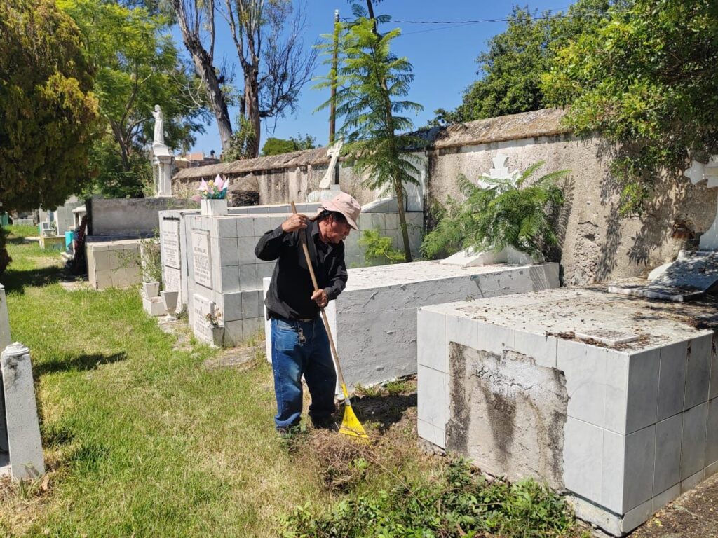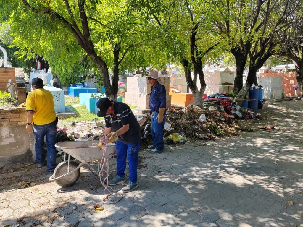 Personal de Panteones y Servicios Municipales ha comenzado labores de limpieza en los cementerios San Elías y Villa de la Paz, con el objetivo de mejorar su imagen y prepararlos para recibir a los visitantes que acudirán a honrar a sus difuntos en los próximos días.