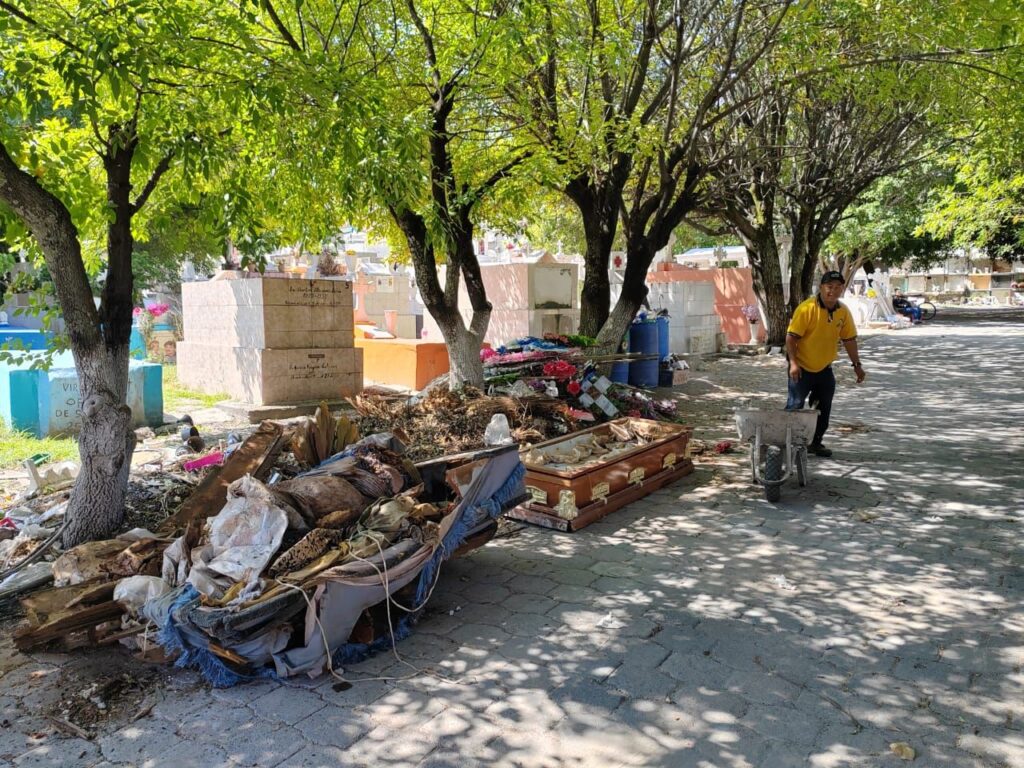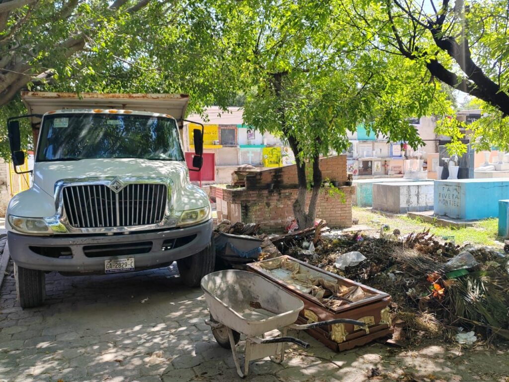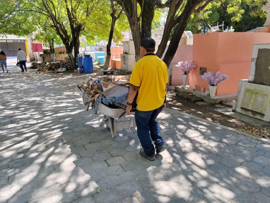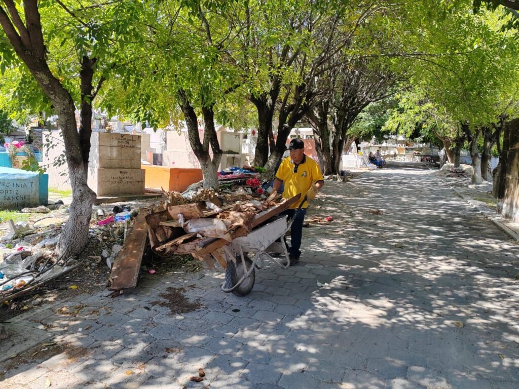 Además, con el apoyo de Servicios Municipales, se han reciclado féretros vacíos que estaban expuestos al aire libre, lo que contribuye a la salubridad del lugar. También se han retirado de los nichos arreglos florales marchitos, tanto naturales como artificiales, y se han llevado a cabo labores de poda de pasto y árboles. Hasta el momento, se ha retirado más de una tonelada y media de basura.
