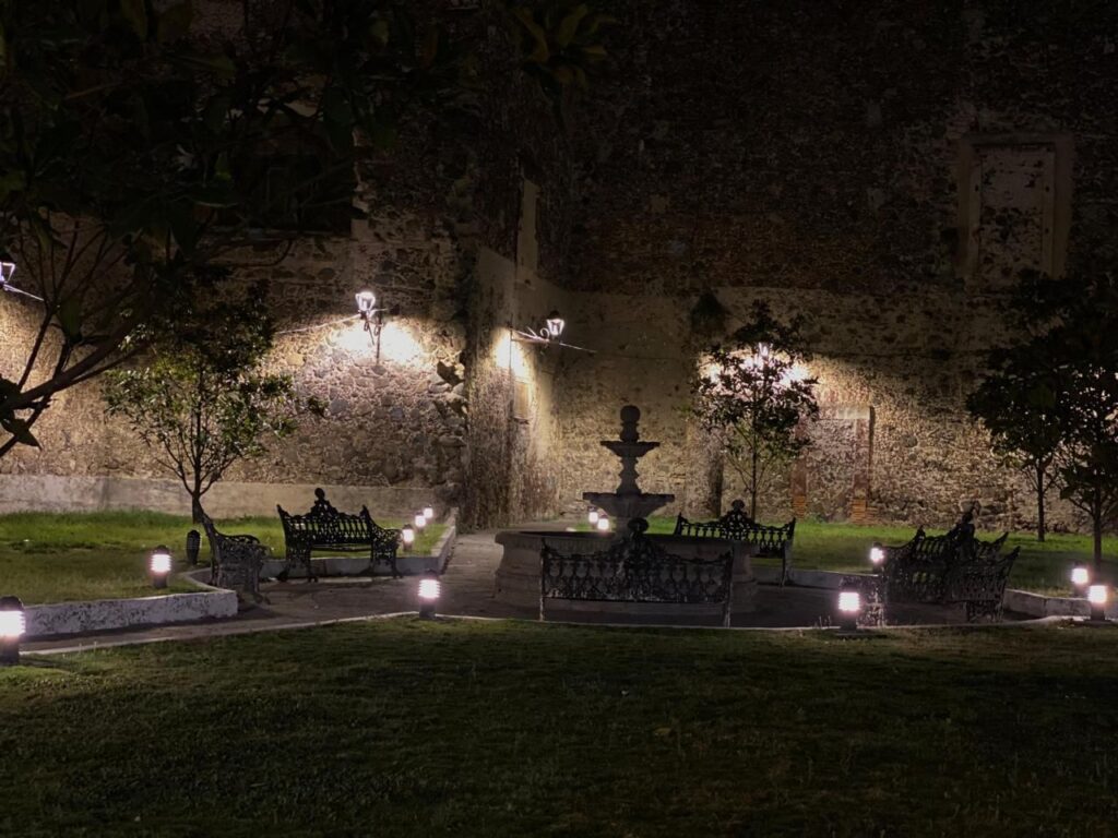 Pues esta leyenda cuenta, que las velas y las luces brillantes son; las almas que penan en este jardín, porque habían muerto en pecado mortal en el hospital que hace muchísimo tiempo se encontraba en el exconvento de capuchinas.