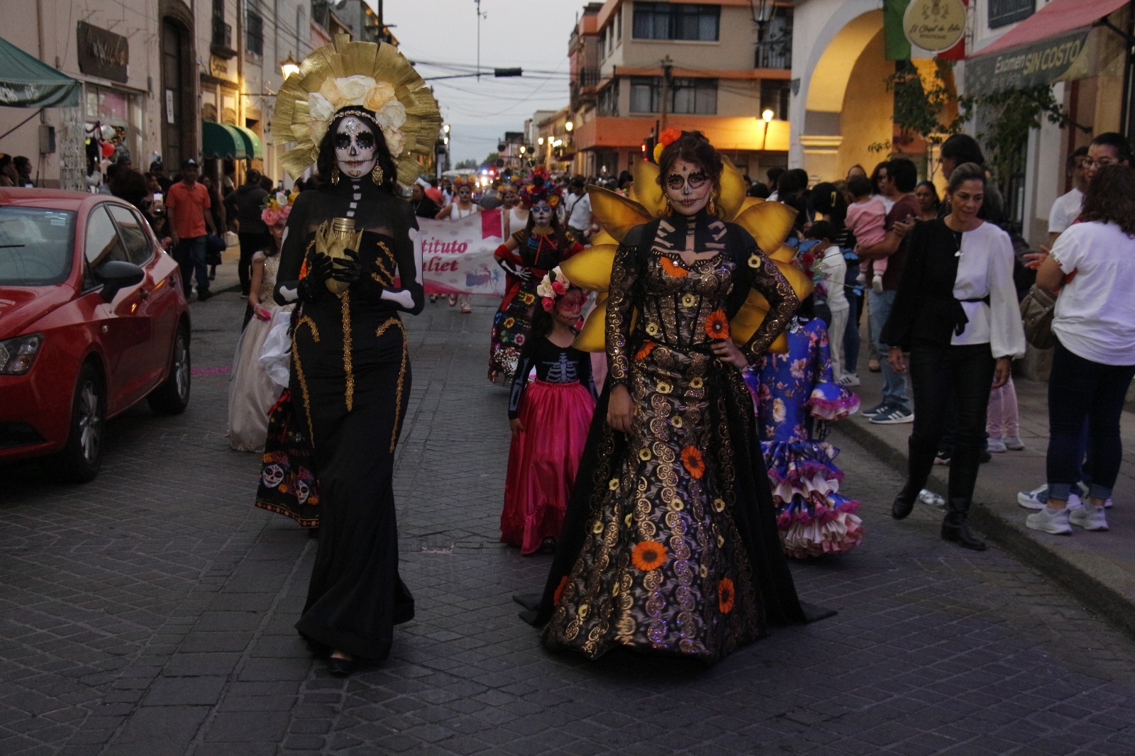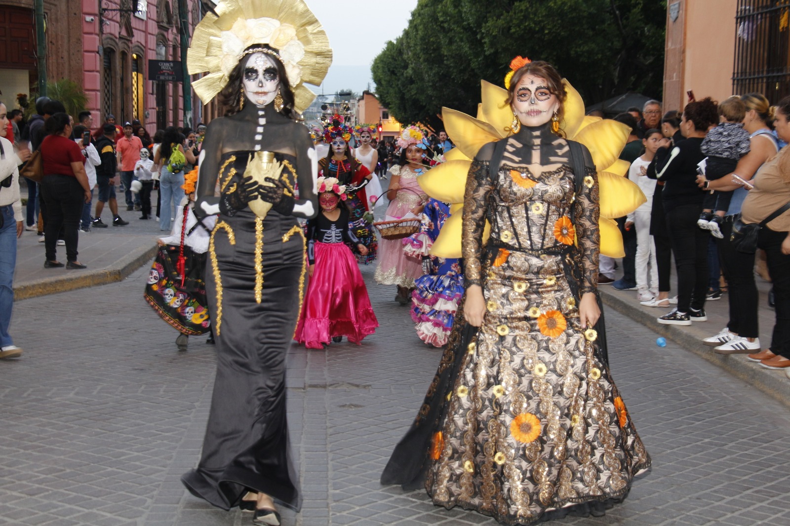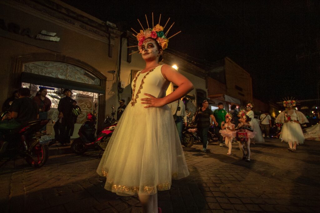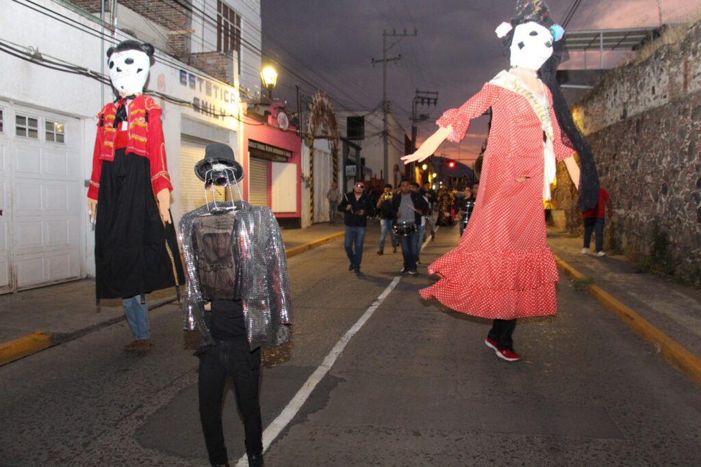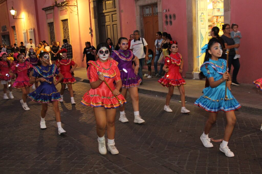 El desfile dio inicio en la esquina de las calles 16 de Septiembre y Hidalgo, con la participación de la Reina de Salvatierra, Bianca Velázquez, y la Princesa Camila Guerrero, quienes desfilaron acompañadas por el grupo de bastoneras “Princesitas” y estudiantes del Instituto Juliet. Todas ellas lucieron espectaculares con vestidos y maquillajes inspirados en la icónica catrina, figura representativa del Día de Muertos. El ambiente festivo fue animado por una banda de viento, las tradicionales mojigangas y algunos ciudadanos que se sumaron a la procesión, llenando las calles de color, música y alegría.