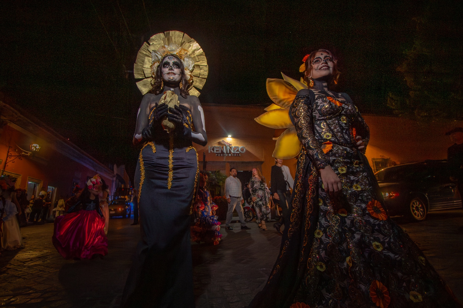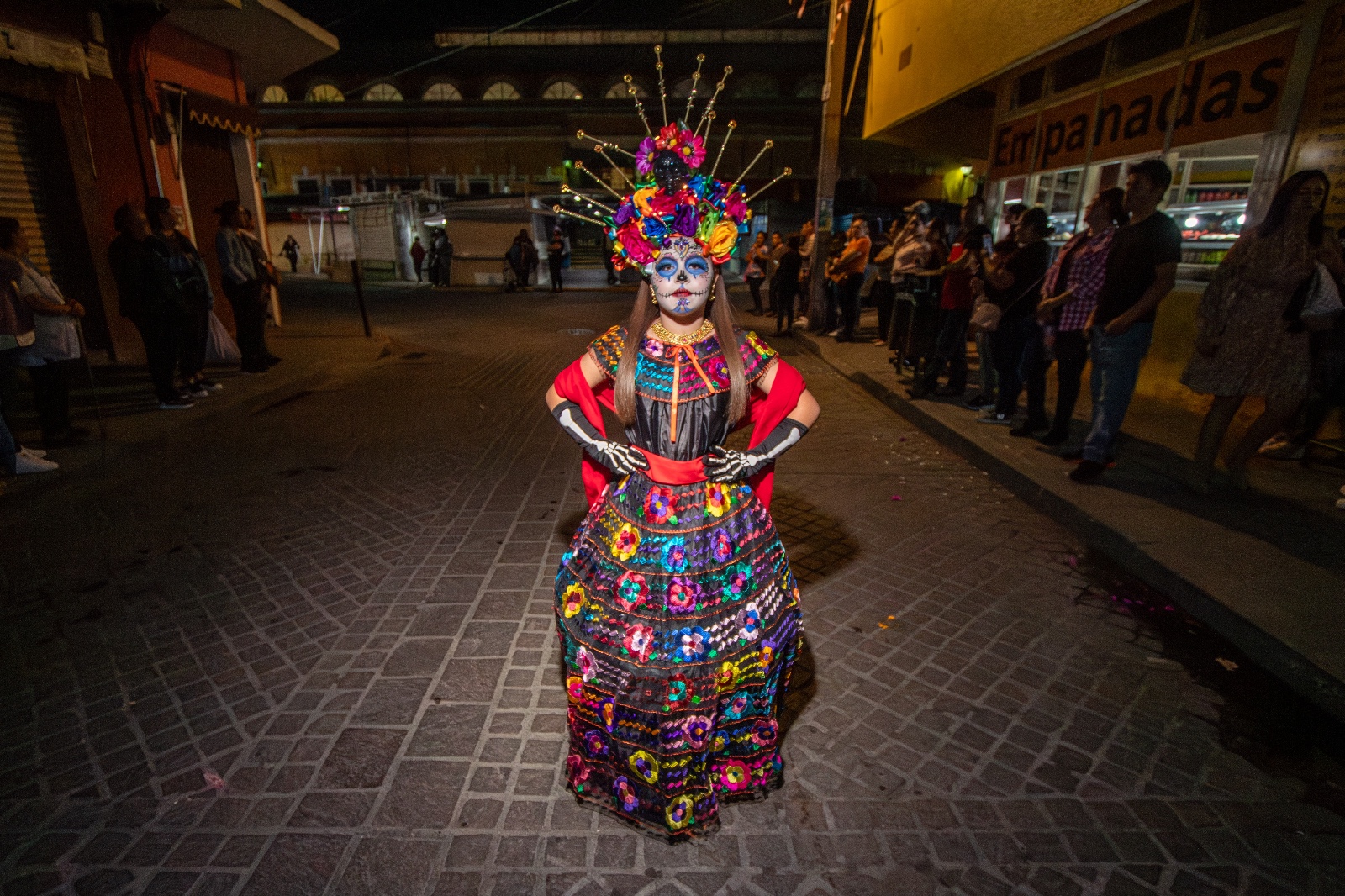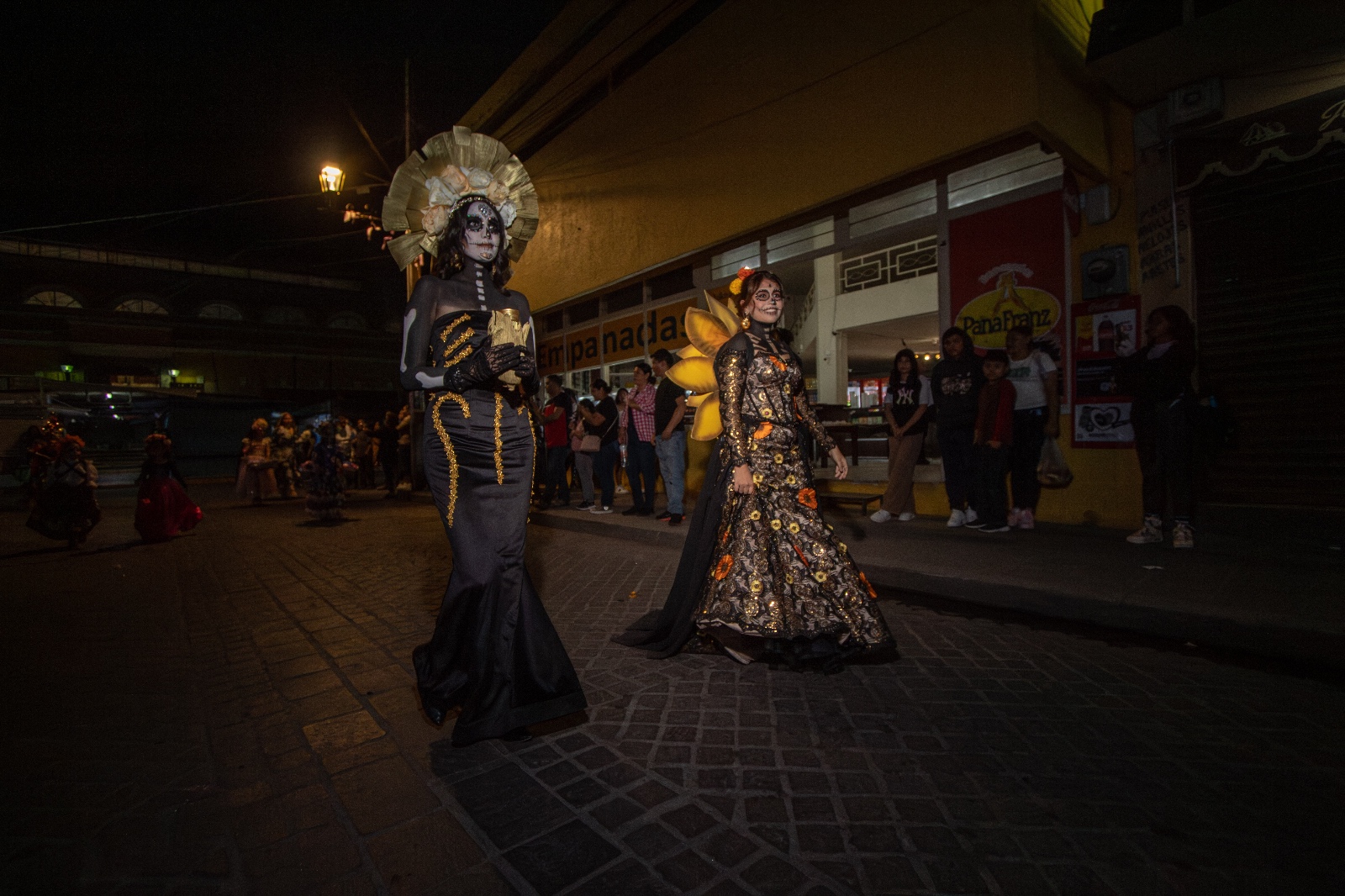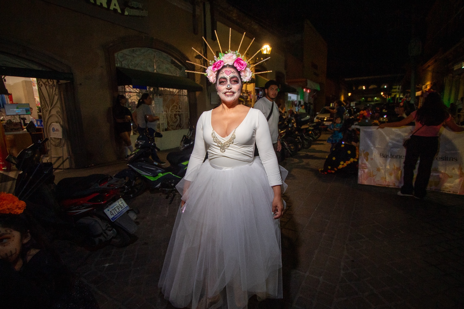 El desfile dio inicio en la esquina de las calles 16 de Septiembre y Hidalgo, con la participación de la Reina de Salvatierra, Bianca Velázquez, y la Princesa Camila Guerrero, quienes desfilaron acompañadas por el grupo de bastoneras “Princesitas” y estudiantes del Instituto Juliet. Todas ellas lucieron espectaculares con vestidos y maquillajes inspirados en la icónica catrina, figura representativa del Día de Muertos. El ambiente festivo fue animado por una banda de viento, las tradicionales mojigangas y algunos ciudadanos que se sumaron a la procesión, llenando las calles de color, música y alegría.