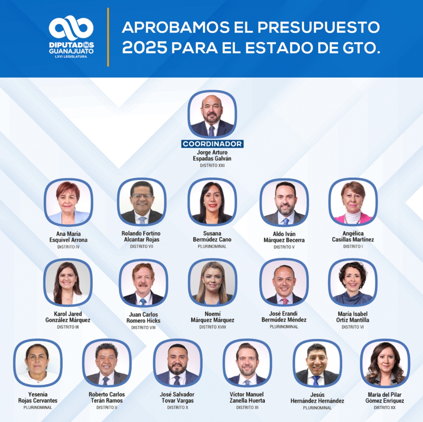 Finalmente, el diputado de Acción Nacional, Jorge Espadas Galván, celebró el acuerdo que se tuvo durante la aprobación del presupuesto estatal y las reservas, en un contexto de diálogo franco, abierto y de frente a la ciudadanía, «hemos construido por Guanajuato, quiero expresar mi gratitud por poner a Guanajuato en primer lugar».