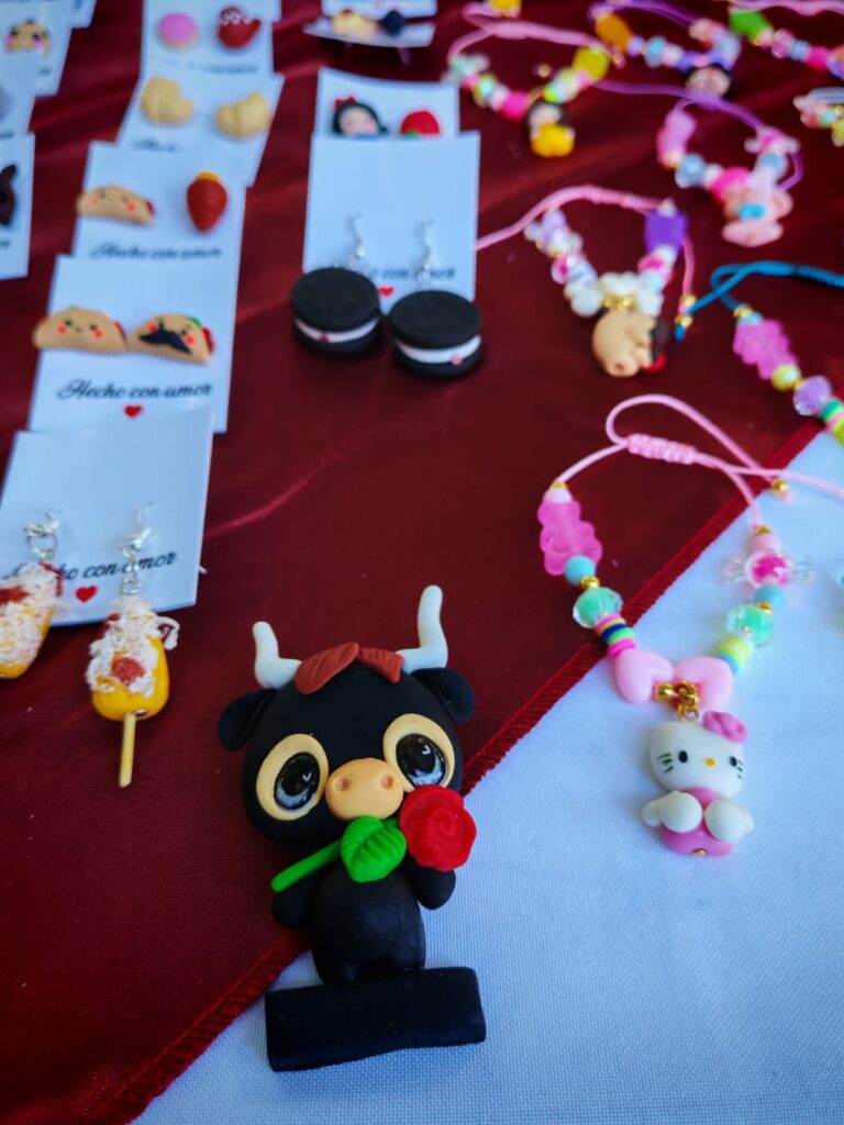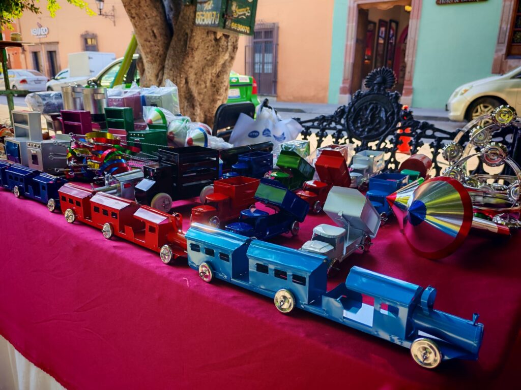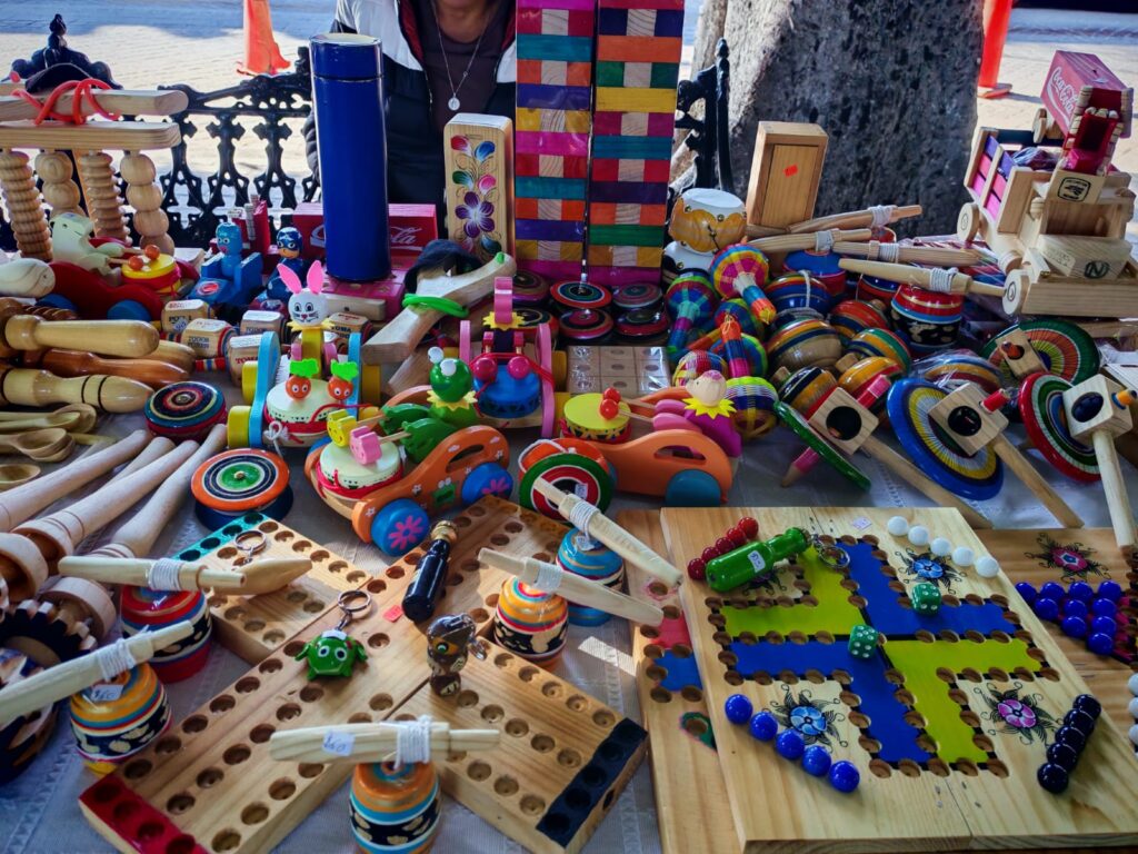 Productos de miel, juguetes de latón y madera, pinturas ,libros mojigangas, pulque directamente de Huamantla, molcajetes y muchas más variedades de productos.