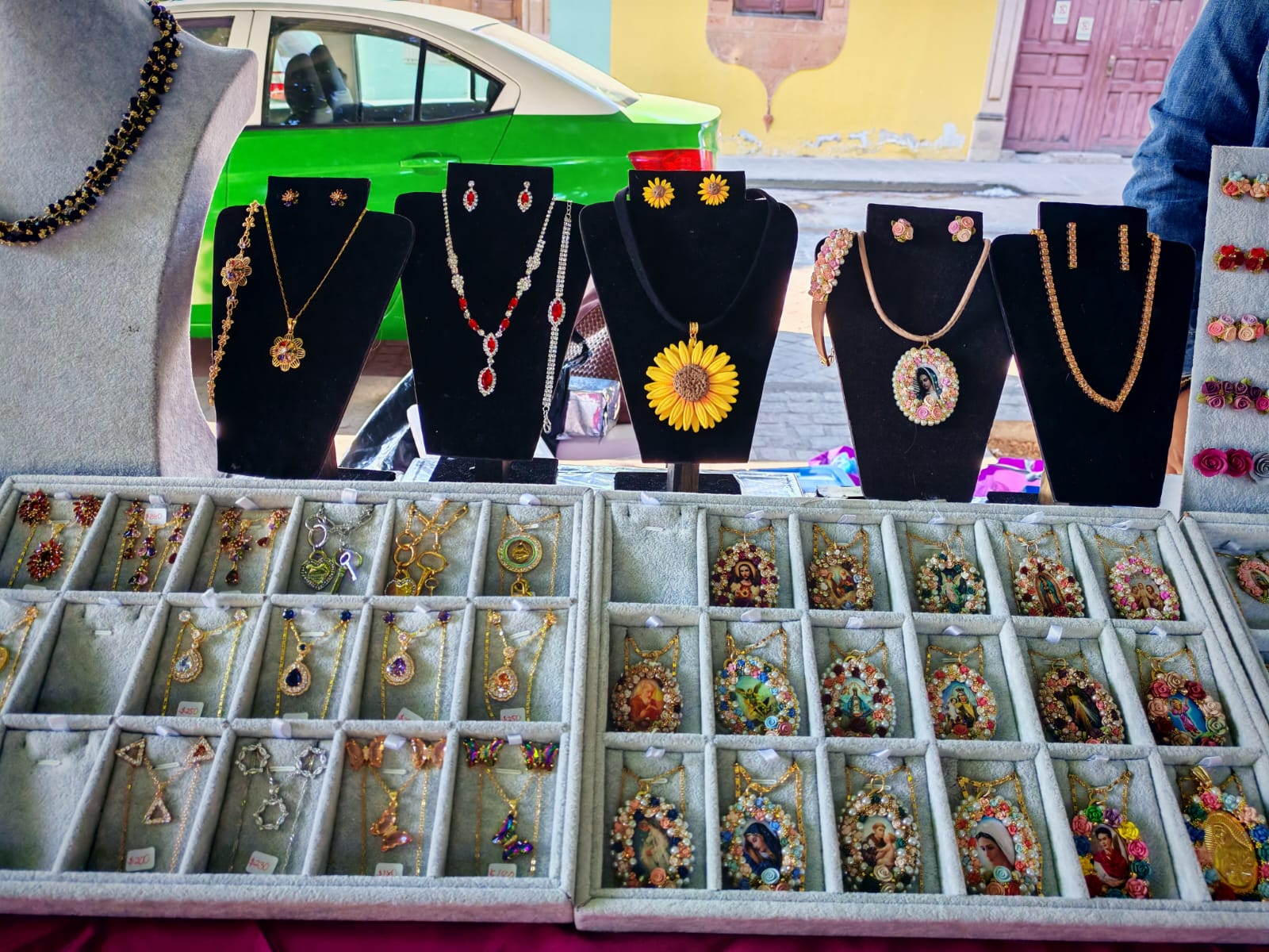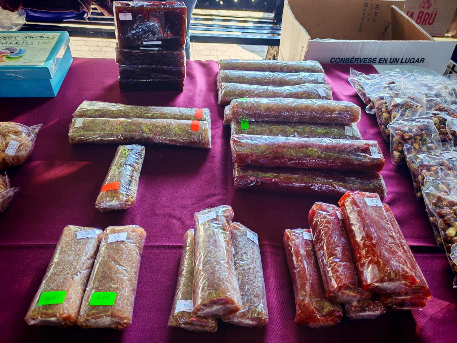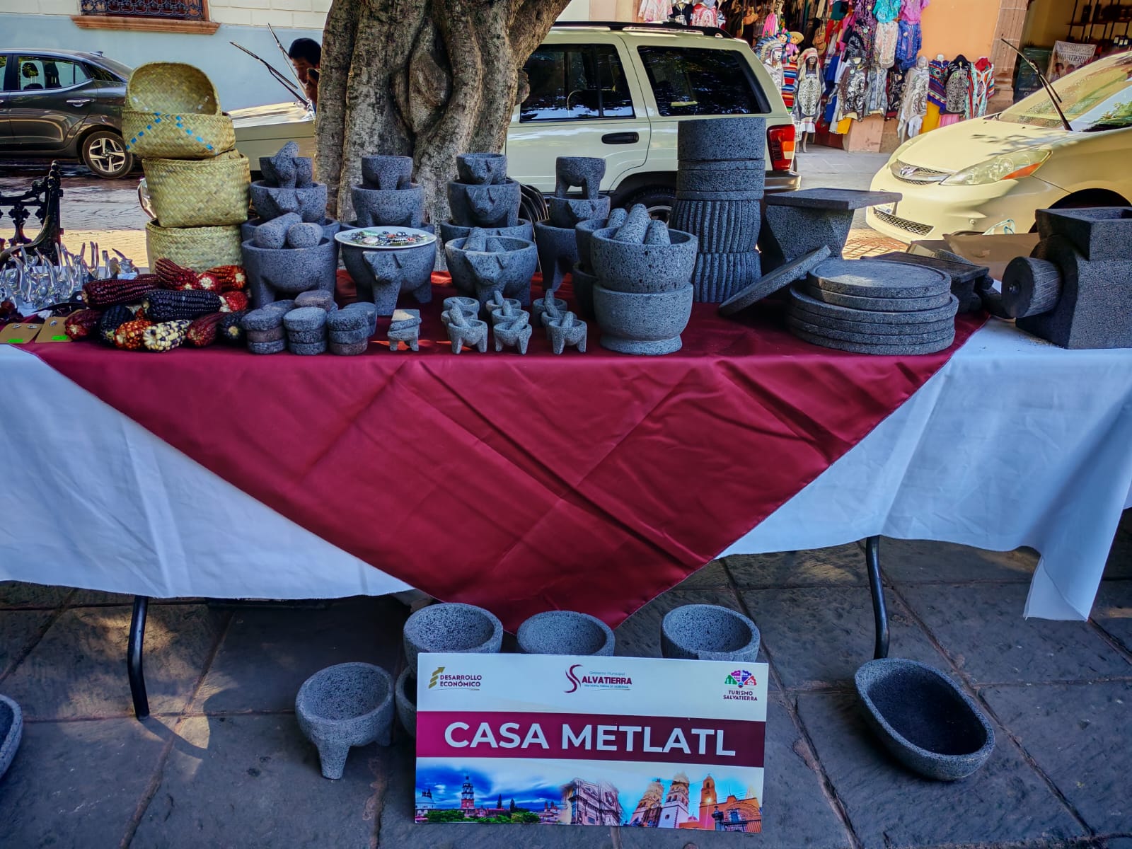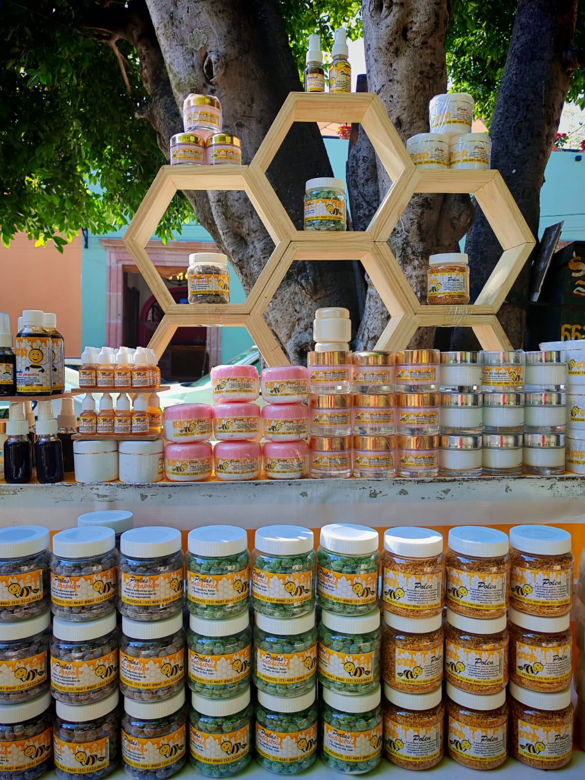Productos de miel, juguetes de latón y madera, pinturas ,libros mojigangas, pulque directamente de Huamantla, molcajetes y muchas más variedades de productos.