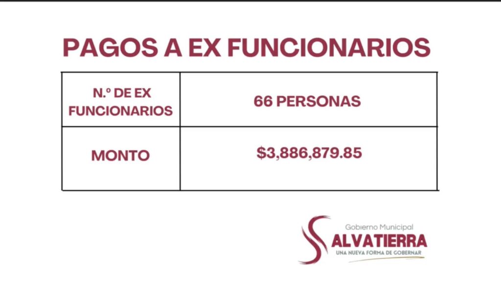 Durante la rueda de prensa mañanera de este lunes 17 de febrero, el presidente municipal anunció el pago de 3 millones 886 mil 879.85 pesos a exfuncionarios de confianza de la administración anterior, quienes habían quedado con un adeudo del 40% de su liquidación. Además, exhibió la desaparición de una deuda en el Sistema Municipal de Agua Potable y Alcantarillado de Salvatierra (SMAPAS), relacionada con un salón de fiestas ubicado junto al Partido Acción Nacional.