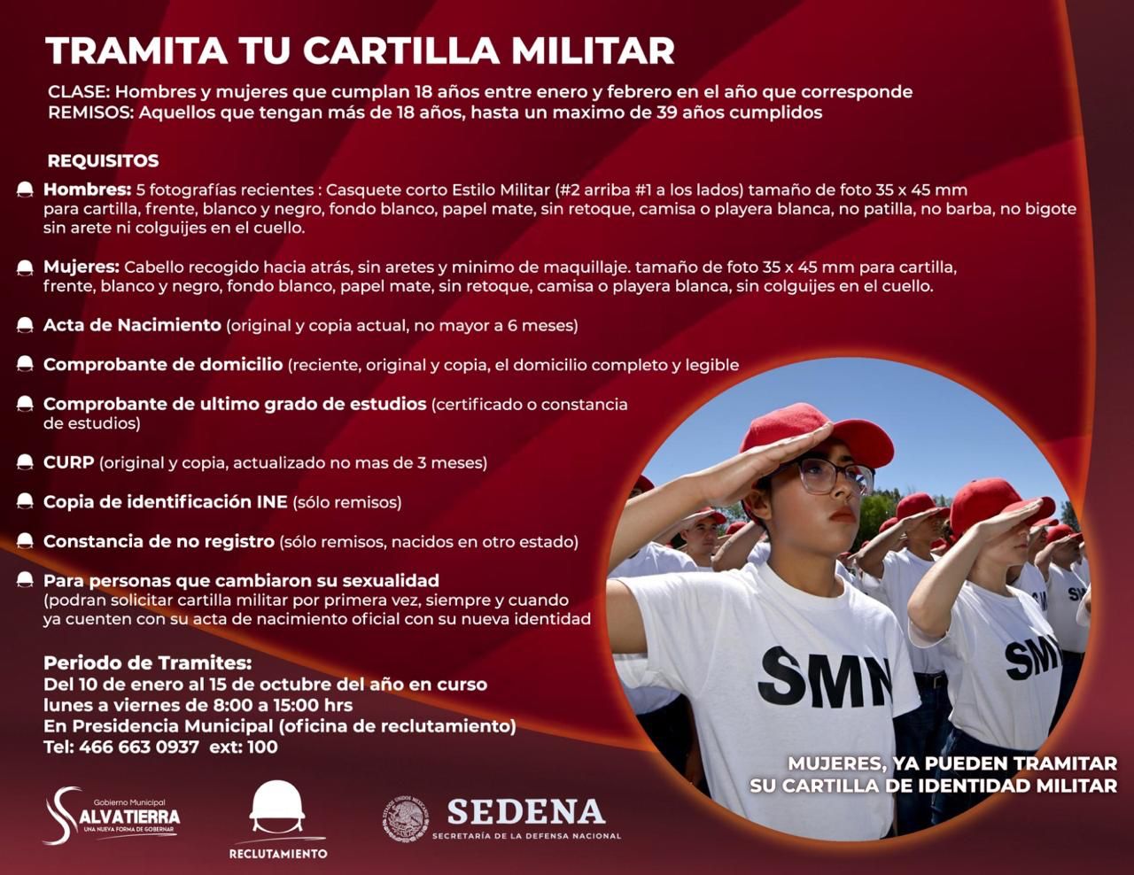 La Coordinación de Reclutamiento del municipio hace un llamado a los jóvenes, hombres y mujeres, que este año cumplen 18 años, así como a los remisos menores de 39 años, para iniciar el trámite de su cartilla militar.