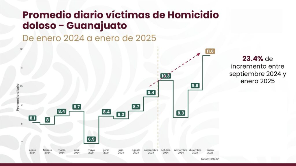Esto, en virtud de que durante la mañanera de la presidenta Claudia Sheinbaum, se presentó la estadística y el reporte de incidencia delictiva en el país, donde en Guanajuato se ha presentado un considerable incremento en la violencia a partir de septiembre del año pasado al mes de enero del presente.