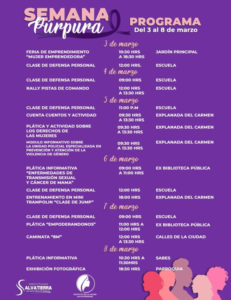 El martes 4 de marzo se realizará un rally de pistas de comando en el CETis 89. Al día siguiente, en la Explanada del Carmen, se llevarán a cabo lecturas de cuentacuentos destacando a escritoras salvaterrenses y nacionales, así como una plática sobre derechos de las mujeres, posteriormente se instalará un módulo informativo de la Unidad Policial Especializada en Prevención y Atención de la Violencia de Género.