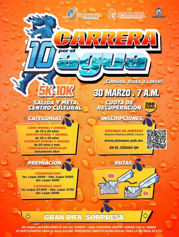 La Junta Municipal de Agua Potable y Alcantarillado de Cortazar (JUMAPAC) invita a la comunidad a participar en la Décima Carrera por el Agua 5K y 10K, un evento deportivo con causa que se llevará a cabo el próximo 30 de marzo a las 7:00 AM en Cortazar, Guanajuato.