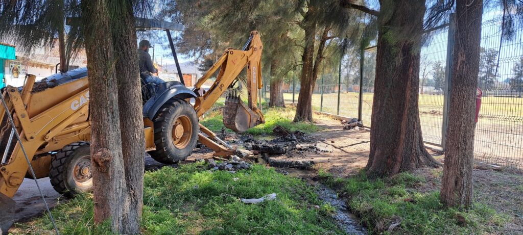 Ante esta situación, se iniciaron trabajos urgentes para solucionar el problema, detectándose un punto de obstrucción en el canal que impedía el flujo adecuado del agua, lo que provocó su desbordamiento hacia los campos y el estacionamiento de la unidad deportiva.