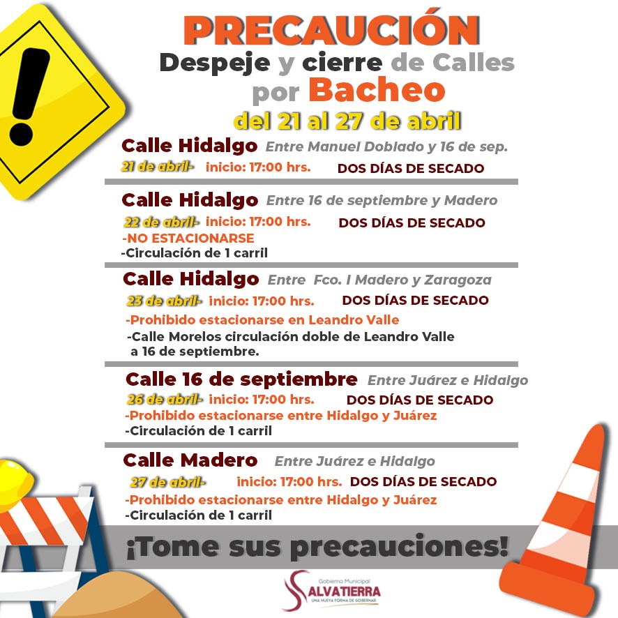 • Del 27 al 29 de abril: bacheo en la calle Madero, entre Hidalgo y Benito Juárez.