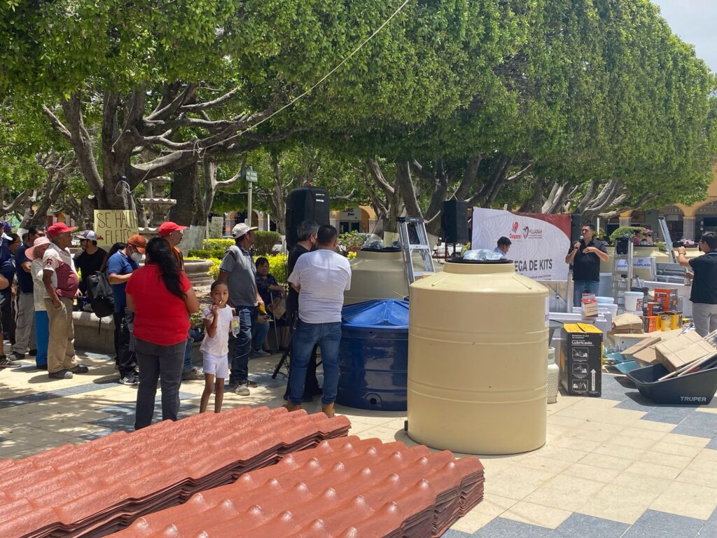 En este día se hizo la entrega de tinacos, bombas para agua, calentadores solares, herramientas eléctricas, para jardinería, limpieza, muebles para baño, pintura, impermeabilizante, rollos de alambre de púas para cercas y de malla ciclón, entre otros.