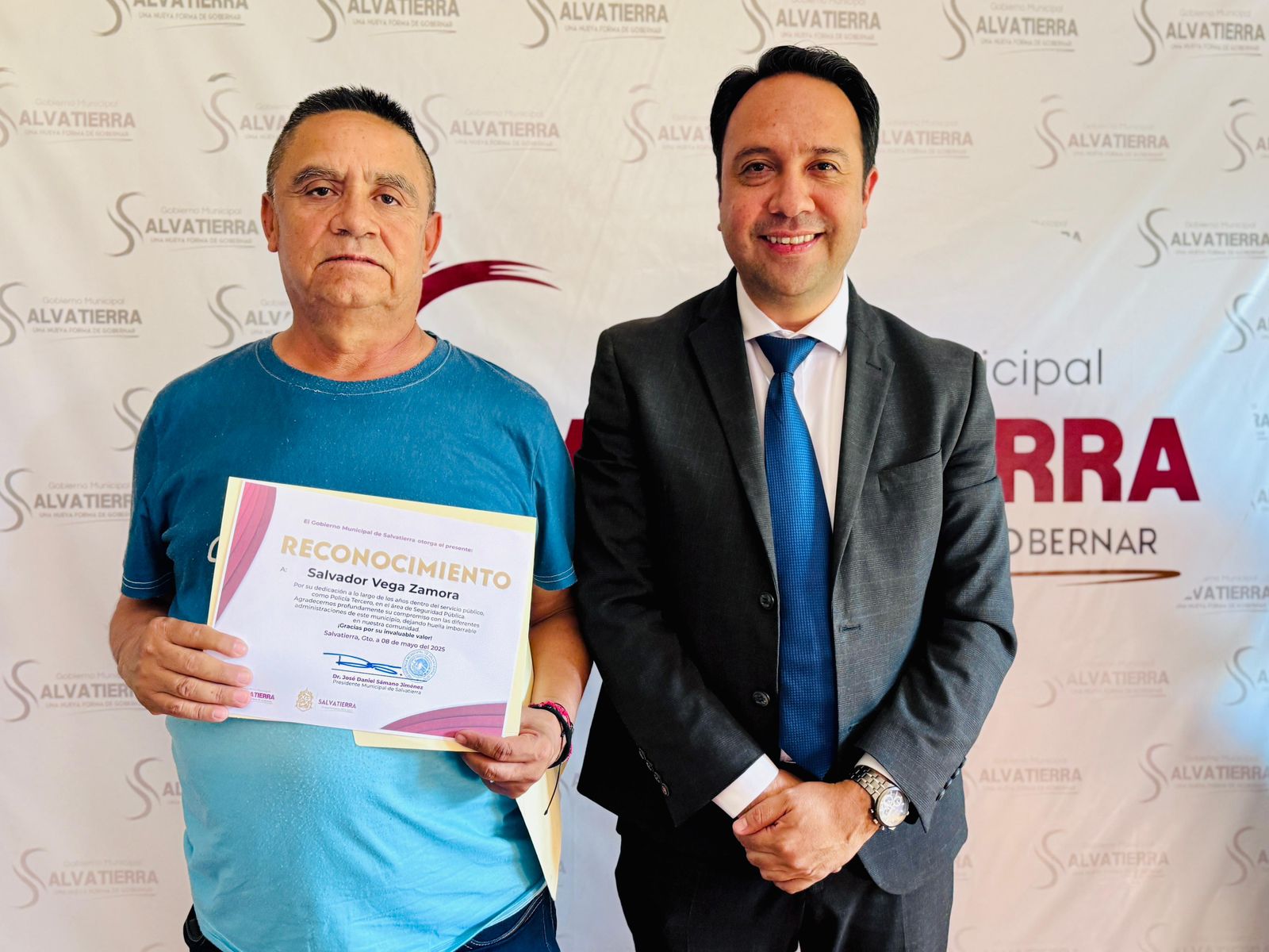 El alcalde Daniel Sámano agradeció al oficial por su honestidad, responsabilidad y profesionalismo, resaltando su contribución en la protección de la integridad física de las familias salvaterrenses durante 30 años ininterrumpidos de servicio.